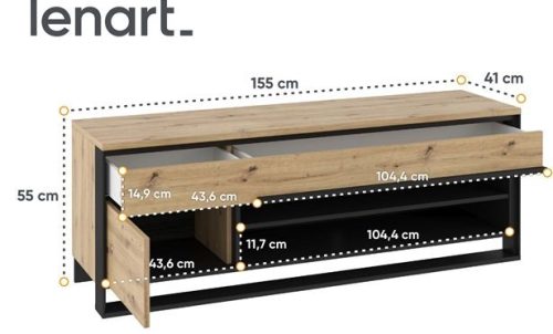 LED osvetlitev: daDimenzije: 1550x550x410 mm RTV komoda QA-04 z vrati, dvema dvižnima predaloma in odprto omarico. Odlična izbira, če želite opremiti svoj prostor s kolekcijo za dnevno sobo in jedilnico Quant, saj so vsi elementi oblikovani v istem slogu in se popolnoma ujemajo med sabo.