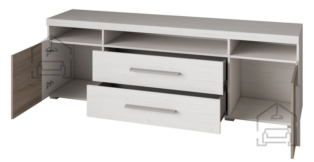 TV komoda Roger ni le estetsko privlačna, ampak tudi izjemno funkcionalna. Opremljena je z dvema vratoma in dvema predaloma, ki nudijo obilo prostora za shranjevanje vaših multimedijskih naprav, DVD-jev, knjig in drugih osebnih predmetov. Takšna zasnova omogoča, da vaš prostor ostane organiziran in urejen, kar prispeva k splošni estetiki vaše dnevne sobe.