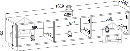 - 1x RTV omarica z 2 odprtima in 1 navadnim predalom na sredini. Dimenzije: 37x180x45 cm.