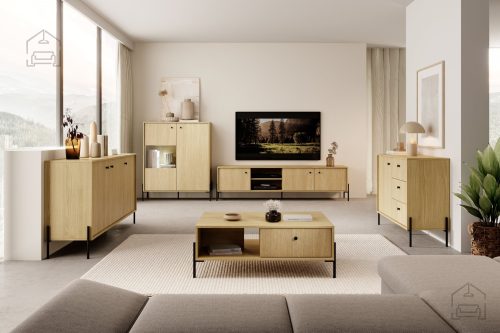 Omara Torin je prilagodljiva in jo lahko postavite samostojno ali v kombinaciji s TV omarico, visoko vitrino ali garderobno omaro. To vam omogoča, da ustvarite čudovito in funkcionalno ureditev dnevne sobe po svojih željah.