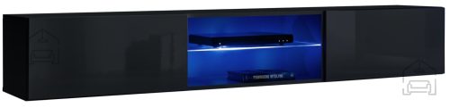 Barva fronta: črna sijajDimenzije: 1800x300x400 mm RTV regal ima na levi in desni strani 1 omarico ter odprto polico v sredinskem delu, ki je osvetljena z modro LED lučko.