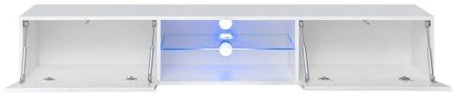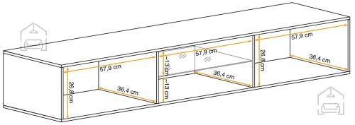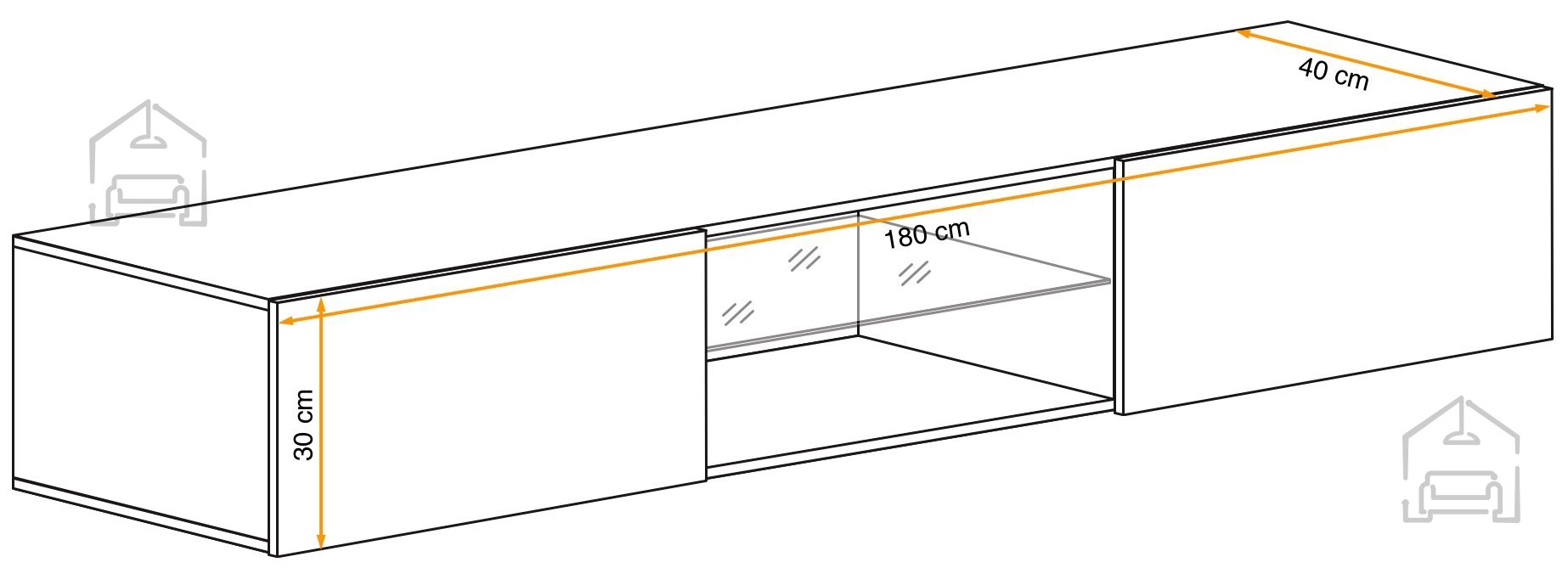 Barva fronta: grafit visok sijajDimenzije: 1800x300x400 mm RTV regal ima na levi in desni strani 1 omarico ter odprto polico v sredinskem delu, ki je osvetljena z modro LED lučko.