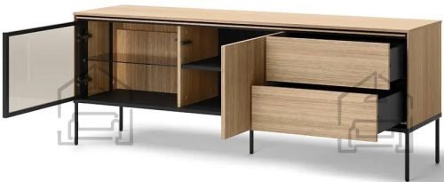 TV komoda je bila zasnovana z mislijo na vaše udobje. Ima prostorne police in predale, kamor boste spravili vso multimedijsko opremo - TV, predvajalnik, konzole, pa tudi kable, daljinske upravljalnike in druge pripomočke. Zahvaljujoč temu bodo vsi elementi vašega zabaviščnega centra vedno na svojem mestu, vi pa boste lahko uživali v redu in preprostem dostopu do vsega, kar potrebujete.
