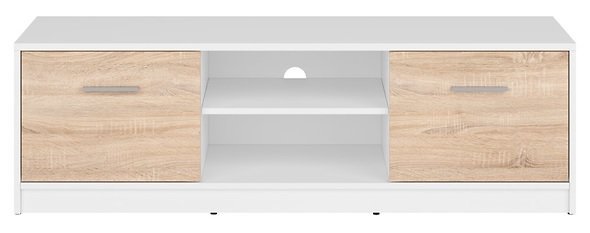 • TV omarica vključuje dve vrati, ki skrivata notranje prostore za shranjevanje, in dva odprta predala, ki so primerni za druge medijske naprave ali dekorativne predmete.