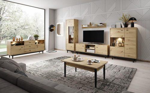 Dimenzije: 1726x567x405 mm Komplet pohištva za dnevno sobo Porto je pohištvo v naravnih barvah umetniškega hrasta, poudarjenega s črnimi kovinskimi ročaji ter okrasnim trakom in lesenimi nogicami.