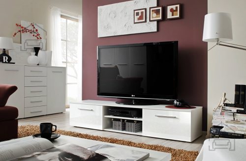 Barva korpusa: bela Barva fronta: bela sijaj Dimenzije: 1800x350x450 mm RTV omara Bono II s predalom na levi in desni strani, na sredini je 1 polica. | Material: Iveral in MDF