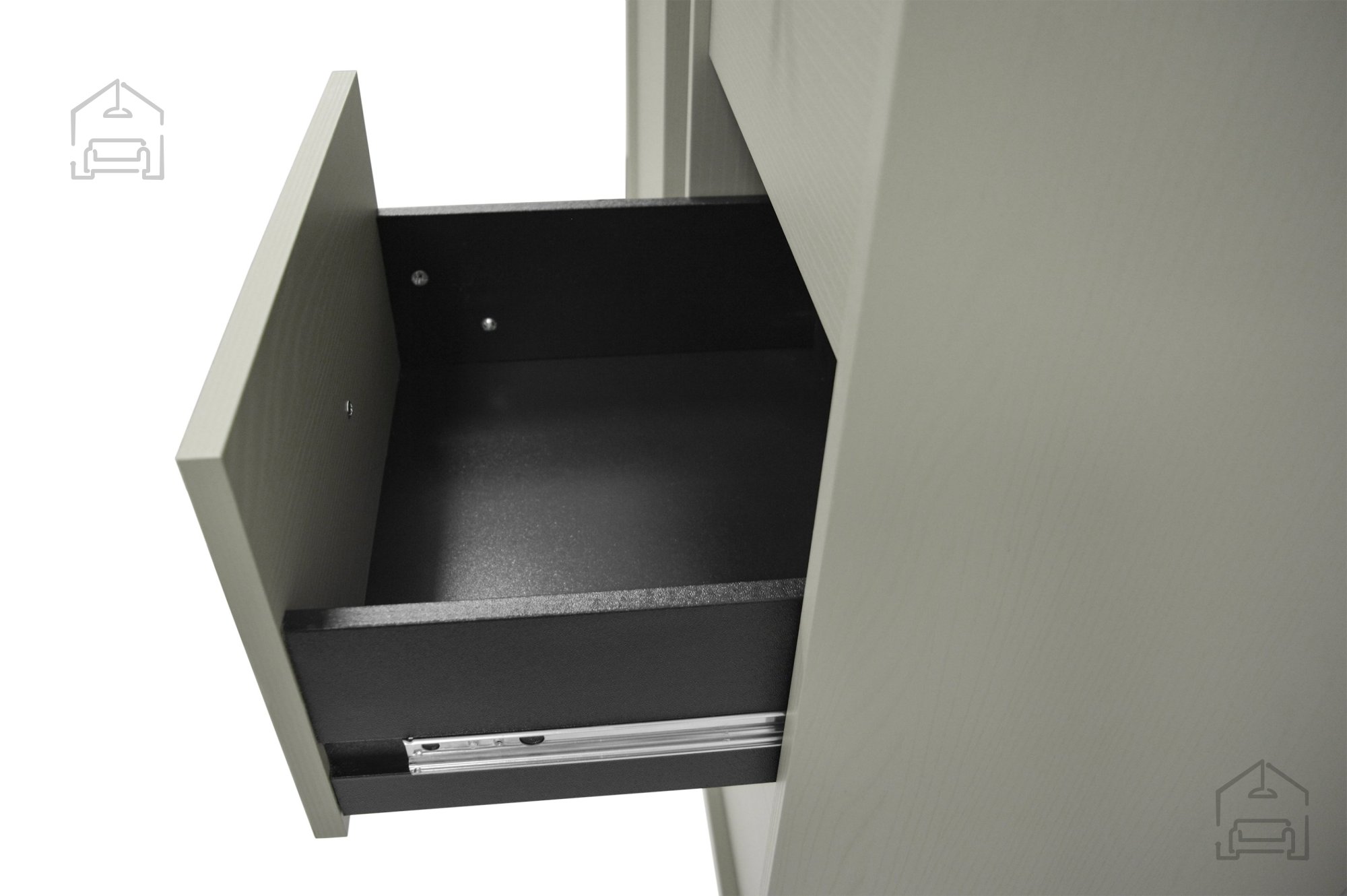 - Konstrukcija vključuje uporabo 16 mm laminirane plošče za sprednji del in korpus omare, kar zagotavlja trdnost in odpornost.