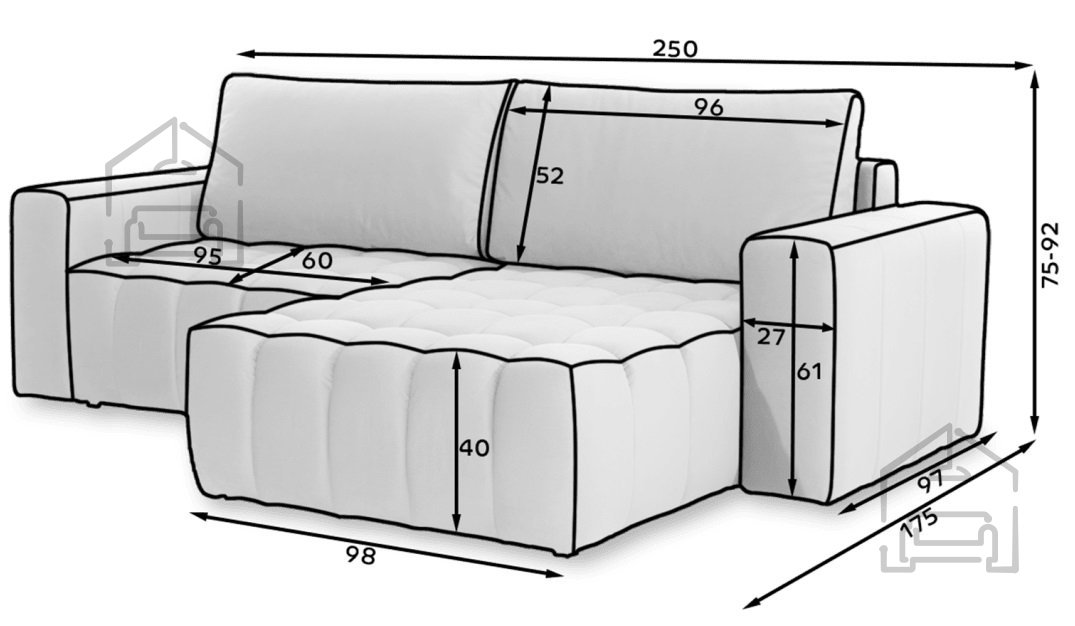 Materiali, ki se uporabljajo pri izdelavi kavčev, sedežnih garnitur, so različne vrste poliuretanskih pen, sintepona, viscolateksa itd., gre za izdelke z visokim koeficientom stisljivosti in elastičnosti, zato si proizvajalec pridržuje pravico do negativne in pozitivne tolerance +/- 2% za širino in dolžino. | Mehanizem: Euro