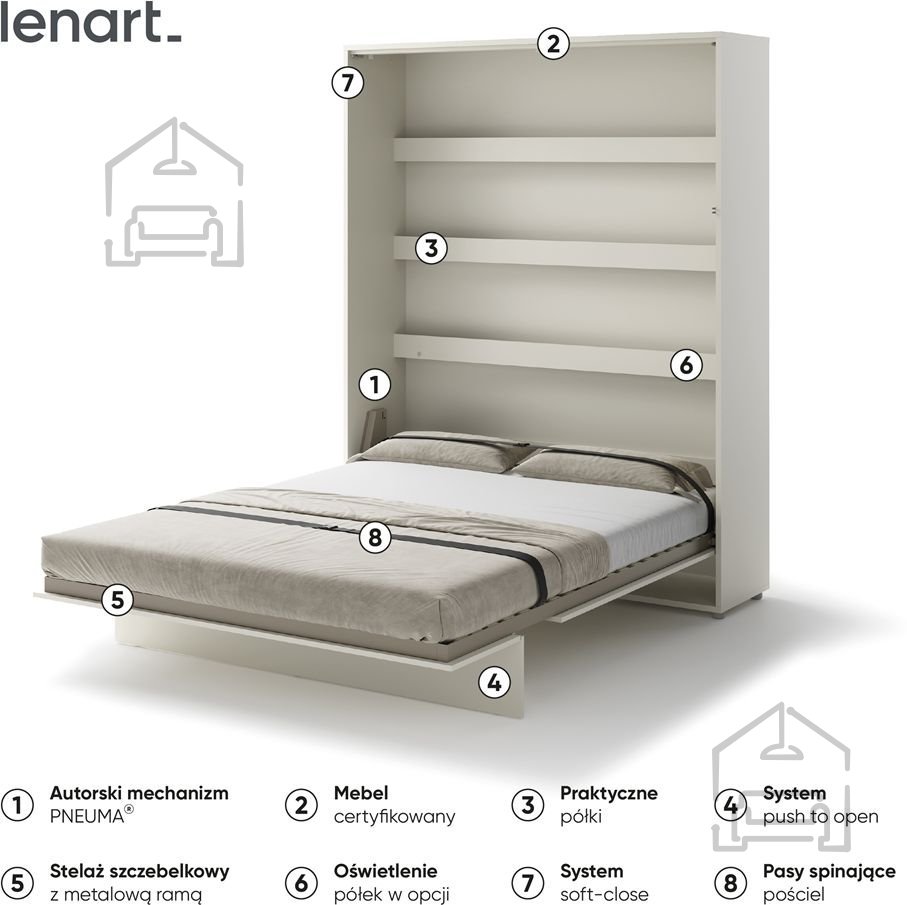 NOTRANJE POLICE Notranje police pomagajo enostavno spraviti posteljo. Na police lahko odložite knjige, spominke ali različne stvari. Vse, kar potrebujete bo na dosegu rok! SISTEM MEHKEGA ZAPIRANJA Bed Concept je opremljena z mehkim sistemom za zapiranje, zaradi česar je zapiranje postelje skoraj neslišno! 3 VRSTE OSVETLITVE Izberete lahko LED luči: nameščene pod policami z induktivnim stikalom in zatemnilnikom, prilagodljive luči za branje z USB polnilcem ali zunanji LED trakovi (trakovi so na voljo le za vertikalno verzijo postelje). VARNOST Bed Concept Murphy so certificirane in preverjene postelje za vso družino ter varne tudi za otroke. Postelja je zasnovana za varno in enostavno uporabo za vse družinske člane.