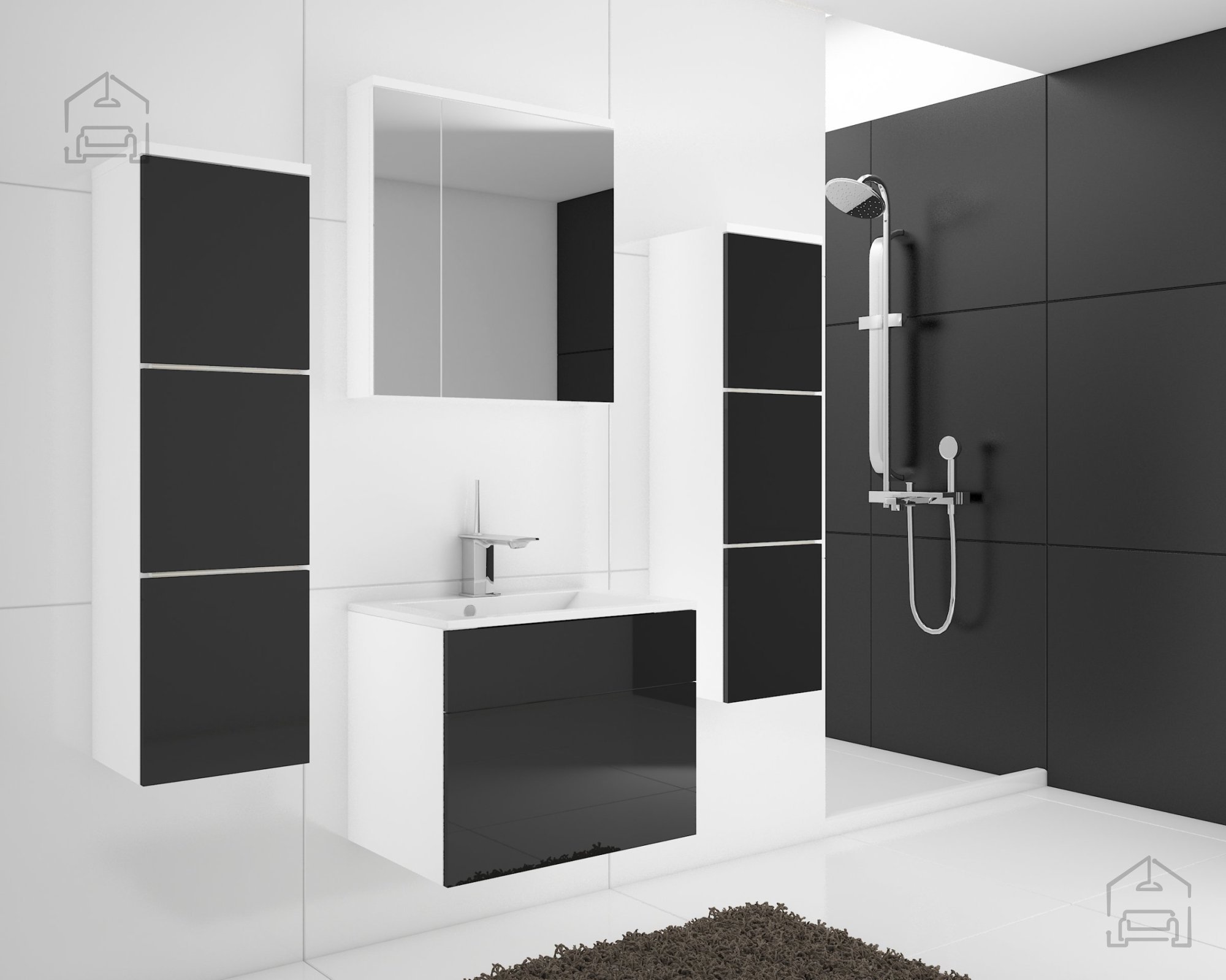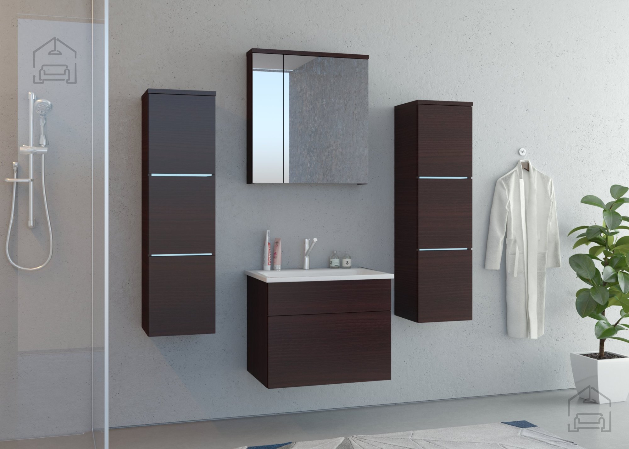 | Kopalniško omarico CERSANIM 60 cm v beli barvi z dvema predaloma mehkega zapiranja je mogoče kombinirati s poličkami cerasin s pultom in nadpultnimi umivalniki linije CERSANIM.