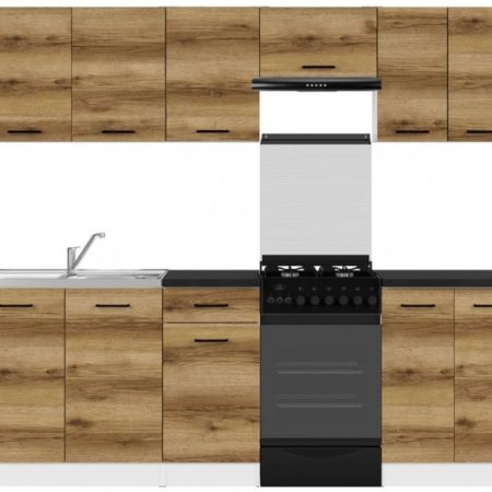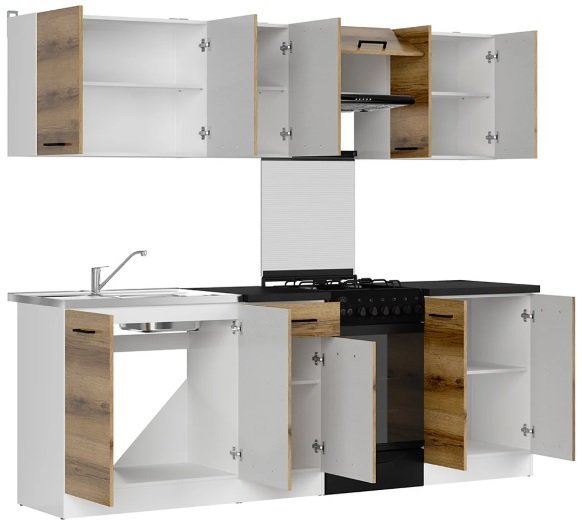 Kuhinjski niz širine 230 cm omogoča prostor za namestitev nape, pomivalnega korita z dvema koritoma in samostoječega štedilnika. Vam vaša kuhinja daje več možnosti? Komplet dopolnite z dodatnimi elementi iz iste kolekcije in uživajte v funkcionalnem dizajnu.
