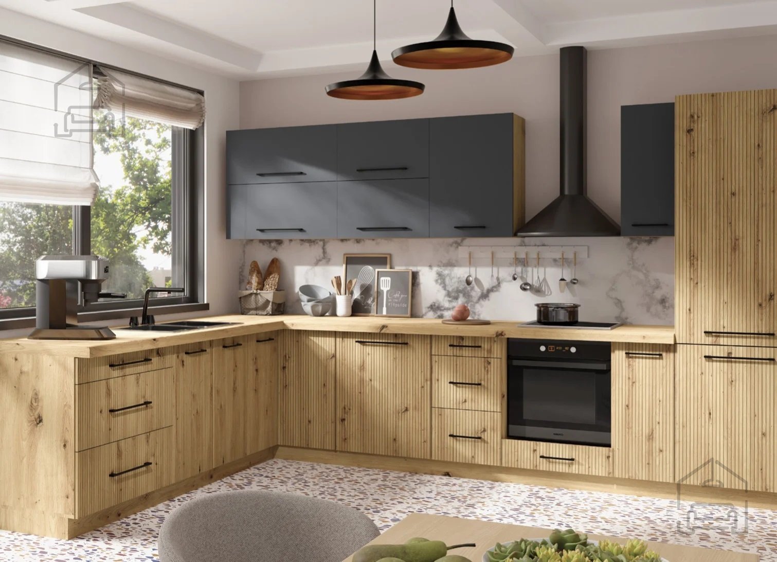 | Kuhinjsko pohištvo Stio je zasnovano za ljubitelje skandinavskega in klasičnega stila. Elegantne, rezkane fronte omaric in predalov ter lepi ročaji so zagotovo njegova prednost. To je sodobno kuhinjsko pohištvo iz visokokakovostnih materialov, primernih za uporabo v kuhinji. Laminirana plošča s povečano odpornostjo na temperaturo, praske in vlago ter trpežna, debela zgornja površina bosta poskrbela za udobje pri pripravi obrokov.
