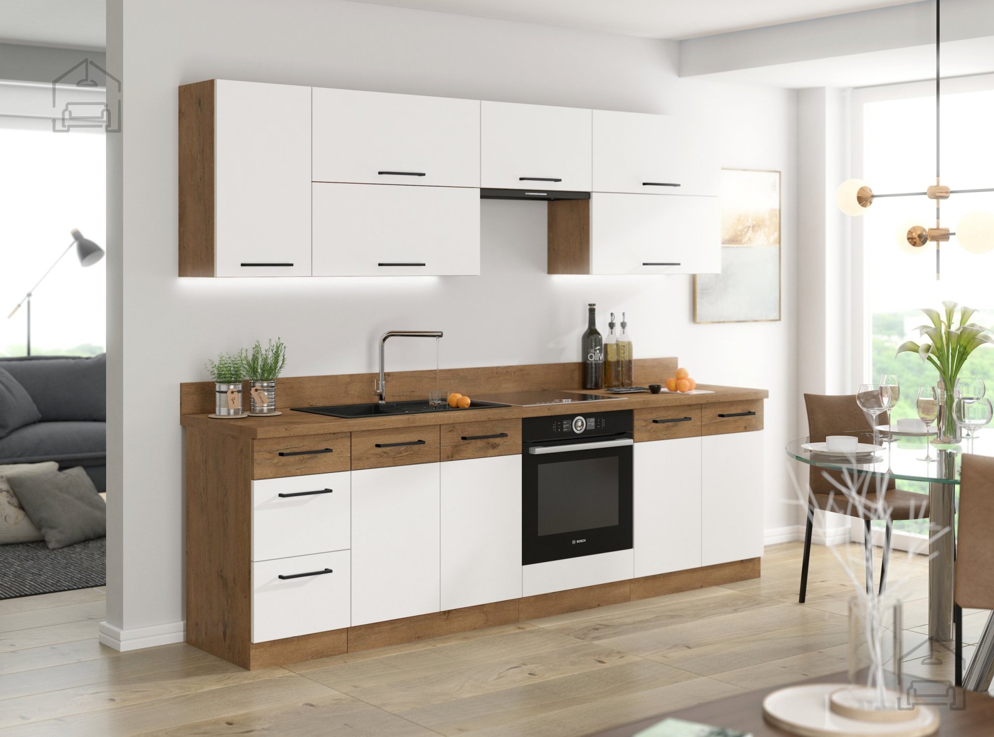 Kuhinja je ena glavnih sob v celotni hiši. Če razmišljate o funkcionalnem in modernem pohištvu, hkrati pa vam je pomembno tudi pravo razmerje med ceno in kakovostjo, ste zadeli glavni dobitek. Kuhinjsko pohištvo Latte iz laminirane plošče odporne na praske in temperaturo. Moderni stil pohištva poudarjajo v beli sijaj in latte hrast barvi.