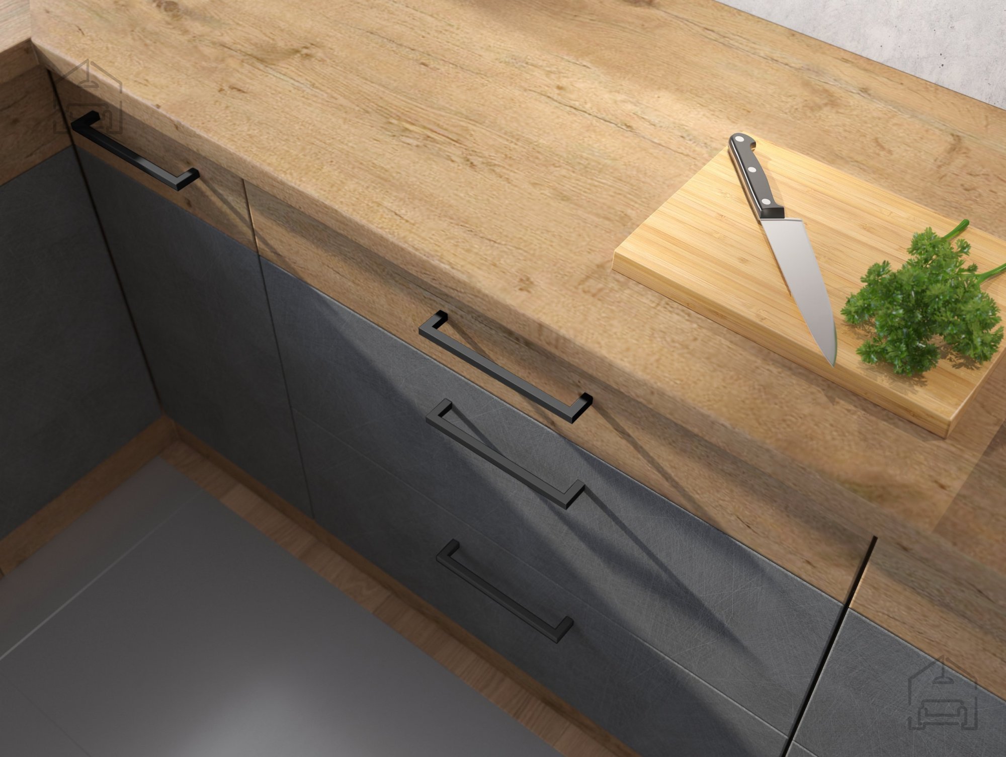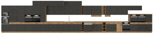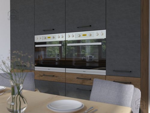 Kuhinja Modena je odlična rešitev za ljudi, ki cenijo udobje. Predali in fronte so opremljeni s posebnim sistemom mehkega zapiranja, zato je njihova uporaba pravi užitek. Modena je vrhunec preprostosti v kombinaciji s sodobnim dizajnom podstrešja, s katerim bo vaša notranjost navdušila vsakogar. Pohištvo je izdelano v popolni barvni kombinaciji – barva hrasta artisan je kombinirana s črnimi mat frontami spodnjih omaric. Ta kombinacija bo vsaki kuhinji dala edinstven značaj. Na estetiko dizajna vpliva tudi podstavek v barvi korpusa, ki odlično dopolnjuje celotno kompozicijo. Dodatna prednost kolekcije so kovinski črni ročaji, ki s svojo minimalistično obliko dajejo kuhinji izjemen značaj.