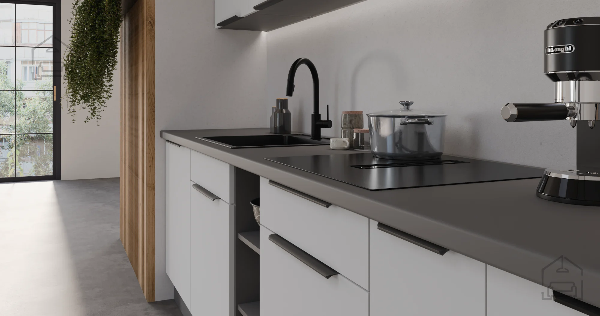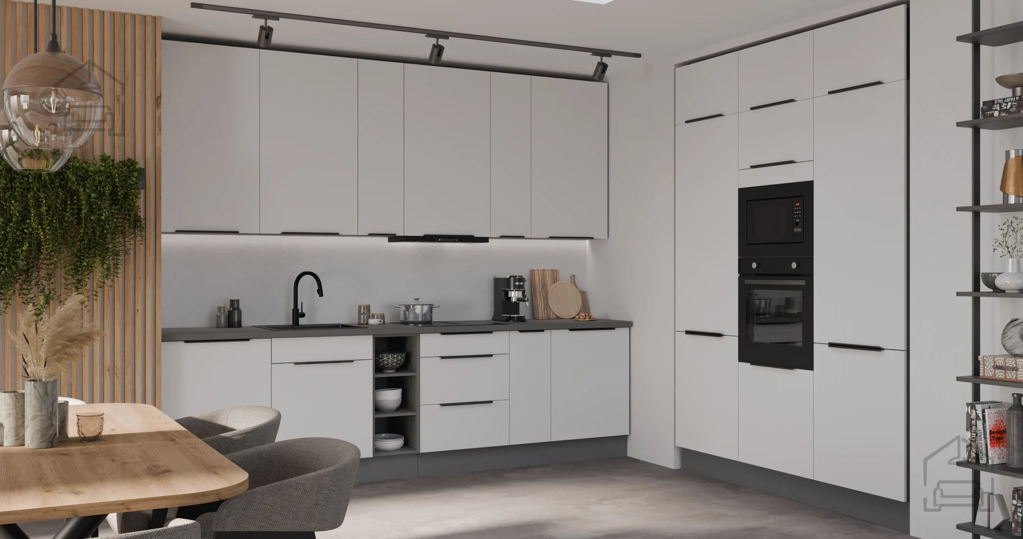 Kuhinjski sestav Aria poljskega proizvajalca Stolarz-Lempert združuje minimalistično estetiko, funkcionalnost in kakovost izdelave, ki jo pričakujete od sodobne kuhinje. Izdelan je iz trpežne laminirane plošče debeline 16 mm, ki zagotavlja dolgo življenjsko dobo, odpornost proti vlagi ter enostavno čiščenje površin. Kombinacija bele in antracitne barve ustvarja sodoben, a hkrati topel videz, ki se lepo ujema z različnimi stili notranje opreme – od modernih do klasičnih ambientov.