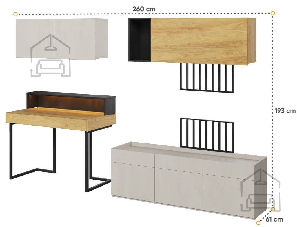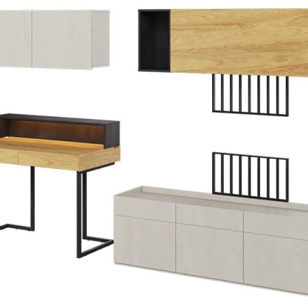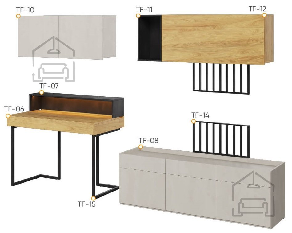 Dizajnersko in izjemno funkcionalno pohištvo s pisalno mizo iz kolekcije TEEN FLEX vam bo zagotovo pomagalo ustvariti moden in funkcionalen interier za mladostnike. Zahvaljujoč univerzalnim barvam bodo zdržale leta in jih je enostavno urediti. SET-09B sestavljajo elementi kot so: miza TF-06, mizna noga TF-15, podaljšek TF-07, viseča omarica TF-10 in TF-12, dva TV panela TF-14, TF-11 polico in TF-08. Ta komplet pohištva za najstnike je odlična ideja za dekleta in fante. | Material: Iveral in masivni les (bor)
