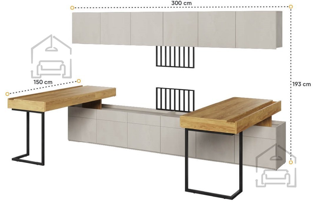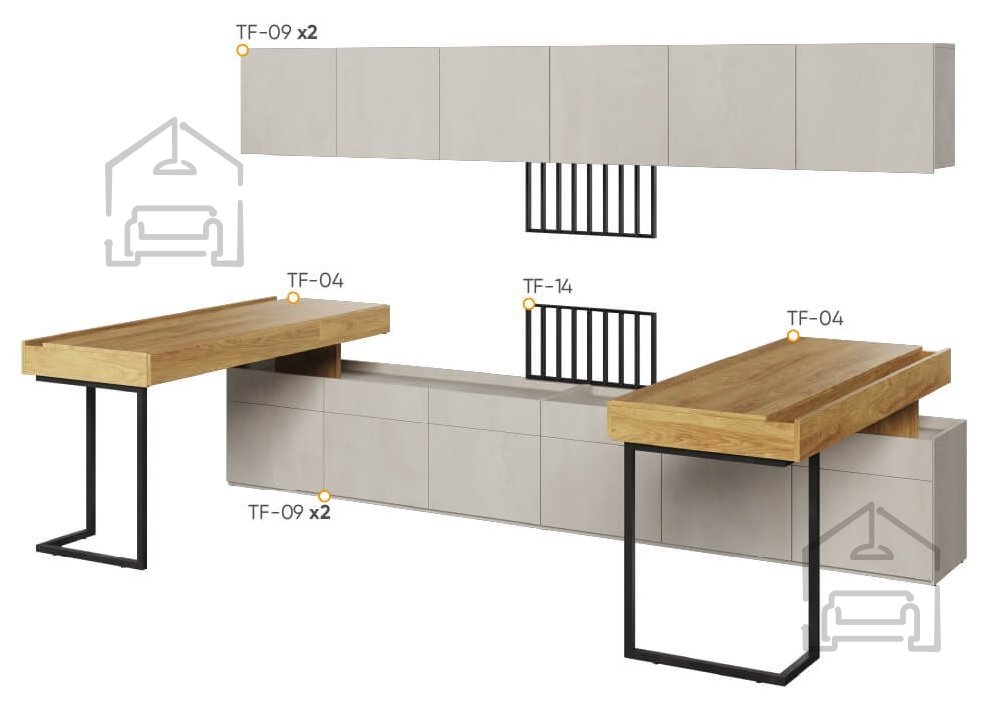 Barva: svileni flou/naravni hikori/surovo jekloDimenzije: 3000x1930x1500 mm Iščete način, kako urediti dizajnersko mladinsko sobo za dva brata in sestro? Pripravljen set iz kolekcije TEEN FLEX– SET-06A bo v tem primeru popoln. Sestavljen je iz sedmih elementov: dveh miz TF-04, dveh omaric TF-08, dveh visečih omaric TF-09 in TV panela TF-14. Zahvaljujoč univerzalnim barvam pohištva se sami odločite za končni karakter prostora. Zanimivi elementi so TV paneli v obliki lamel, ki so opremljeni z energijsko oranžno osvetlitvijo. Ne delujejo le kot dodaten vir svetlobe, ampak tudi v notranjost vnašajo zanimivo vzdušje. | Material: Iveral