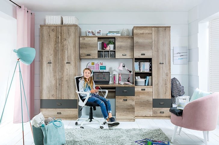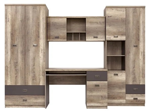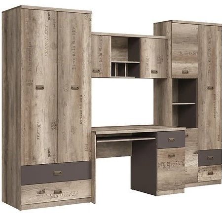 Stenska enota vključuje pisalno mizo s široko ploščo za študij, knjižno omaro za shranjevanje knjig in zvezkov ter prostorne omare za splošno shranjevanje.