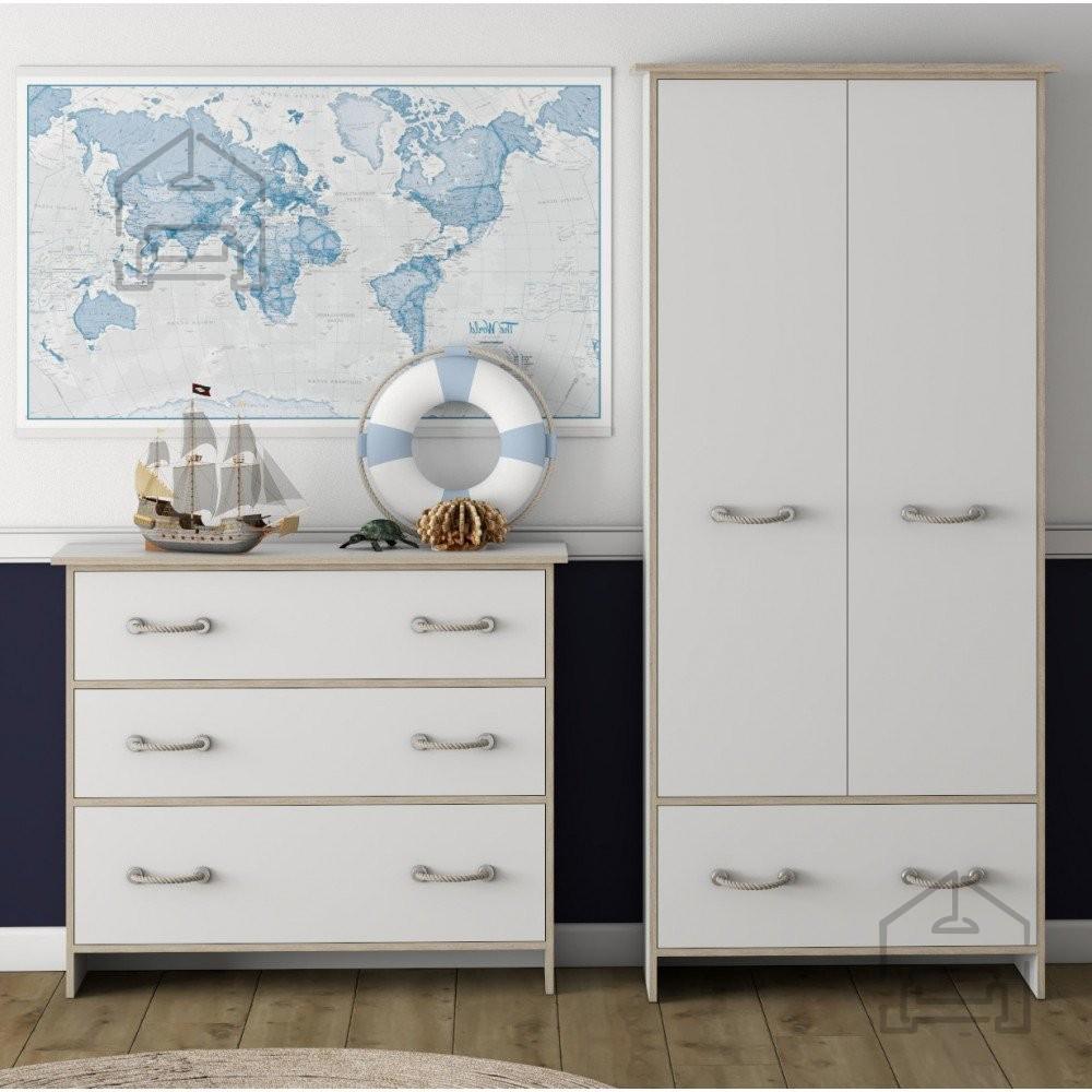 Posebnost garderobne omare Kosmo so dekorativni ročaji v obliki mornarske vrvi. Ti unikatni ročaji dodajo poseben čar in stil, ki se odlično prilega celotni zasnovi omare. Ne samo, da so estetsko privlačni, ampak tudi funkcionalni, saj omogočajo enostavno odpiranje in zapiranje omare.