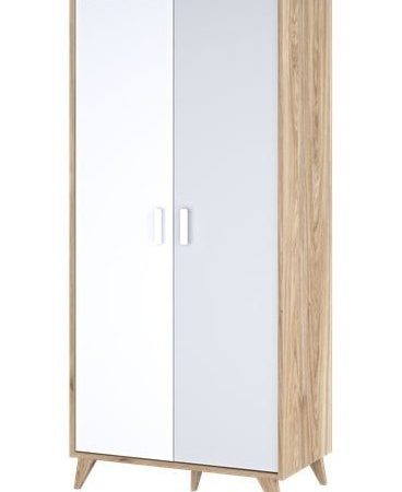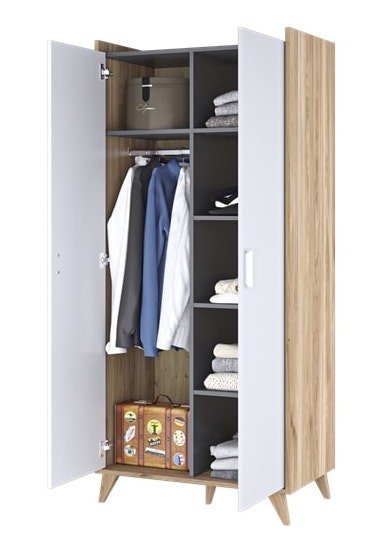 Ročaji: leseneDimenzije: 850x1870x510 mm Dvovratna omara s prostornimi policami in drogom za obešanje oblačil. Pohištvo iz kolekcije Mood bo odlična izbira za sobe deklet, ki rade iščejo nenavadne rešitve. Univerzalna barvna kombinacija, ki uporablja lepoto bele, sive in lesenega dekorja, naredi pohištvo primerno za vsak interier in brezčasno. Dizajnerski elementi, ki pohištvu dodajo čar, so geometrijski ročaji in vitke noge.