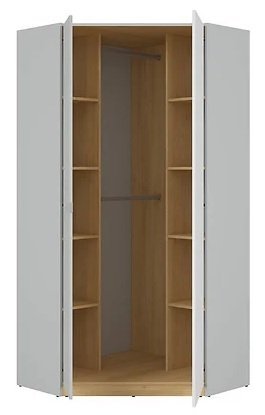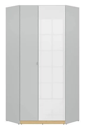 Dimenzije: 930x2005x930 mm Prostorna 2-vratna kotna omara Nandu združuje funkcionalnost s sodobnim dizajnom, ustvarjajoč popolno shranjevalno rešitev za vašo sobo. S premišljeno zasnovo in prostorno notranjostjo bo ta kotna omara postala nepogrešljiv del vašega doma. Kotna omara Nandu prinaša svež in sodoben videz v vaš prostor. Kombinacija svetlo sivega korpusa in belih sijajnih front ustvarja eleganten in estetsko dovršen dizajn.