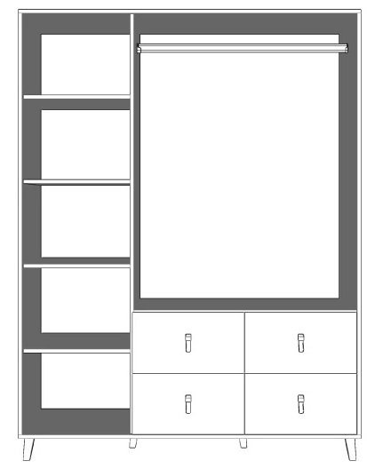 Notranjost omare je zasnovana z mislijo na prostornost in organizacijo. Na levi strani se nahajajo štiri police, ki so odlične za shranjevanje oblačil, knjig ali igrač. V desnem delu omare pa se nahaja oblečna palica, ki omogoča shranjevanje daljših oblačil, kot so plašči, srajce ali jakne. Pod tem predelom je dovolj prostora za čevlje ali nahrbtnike.