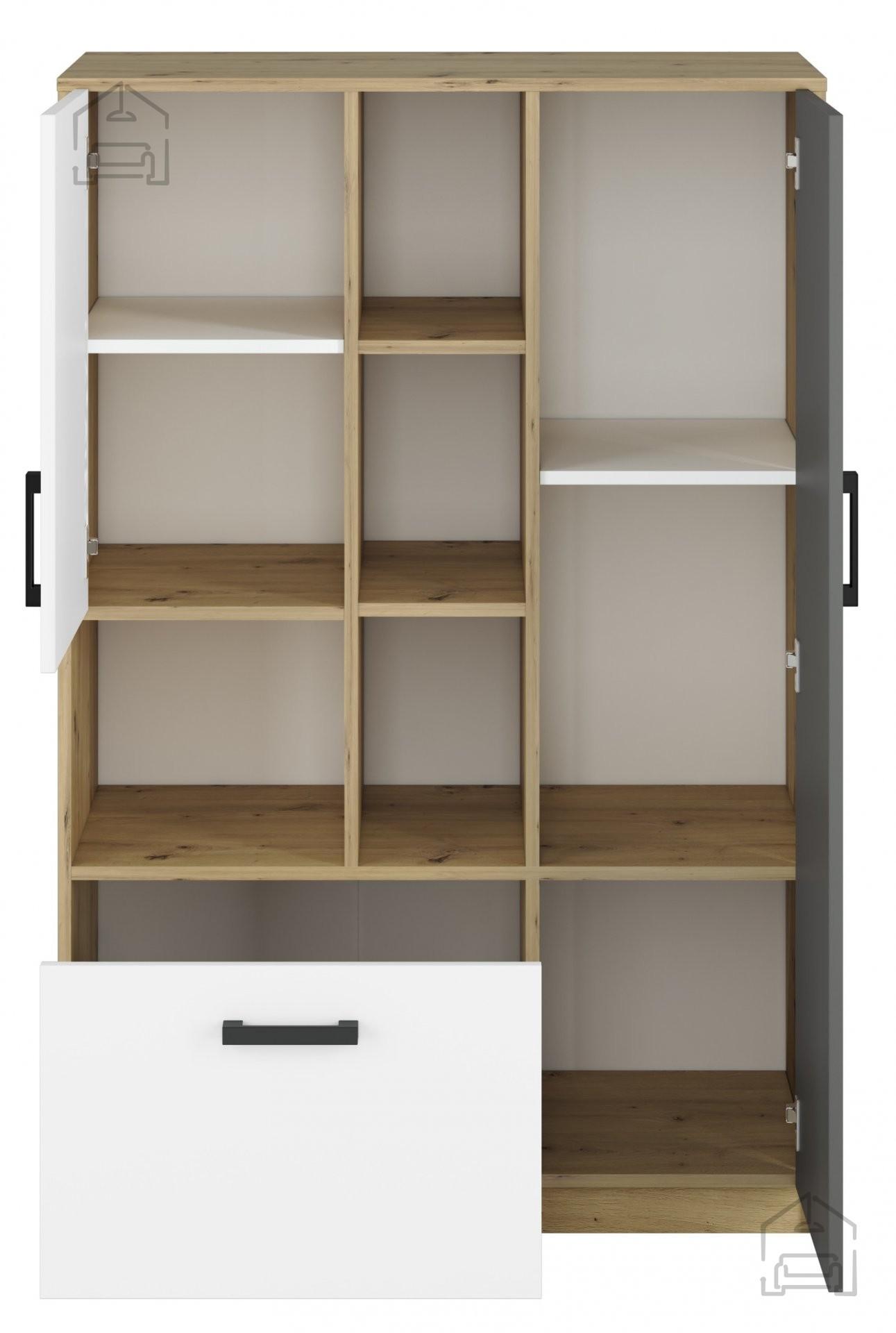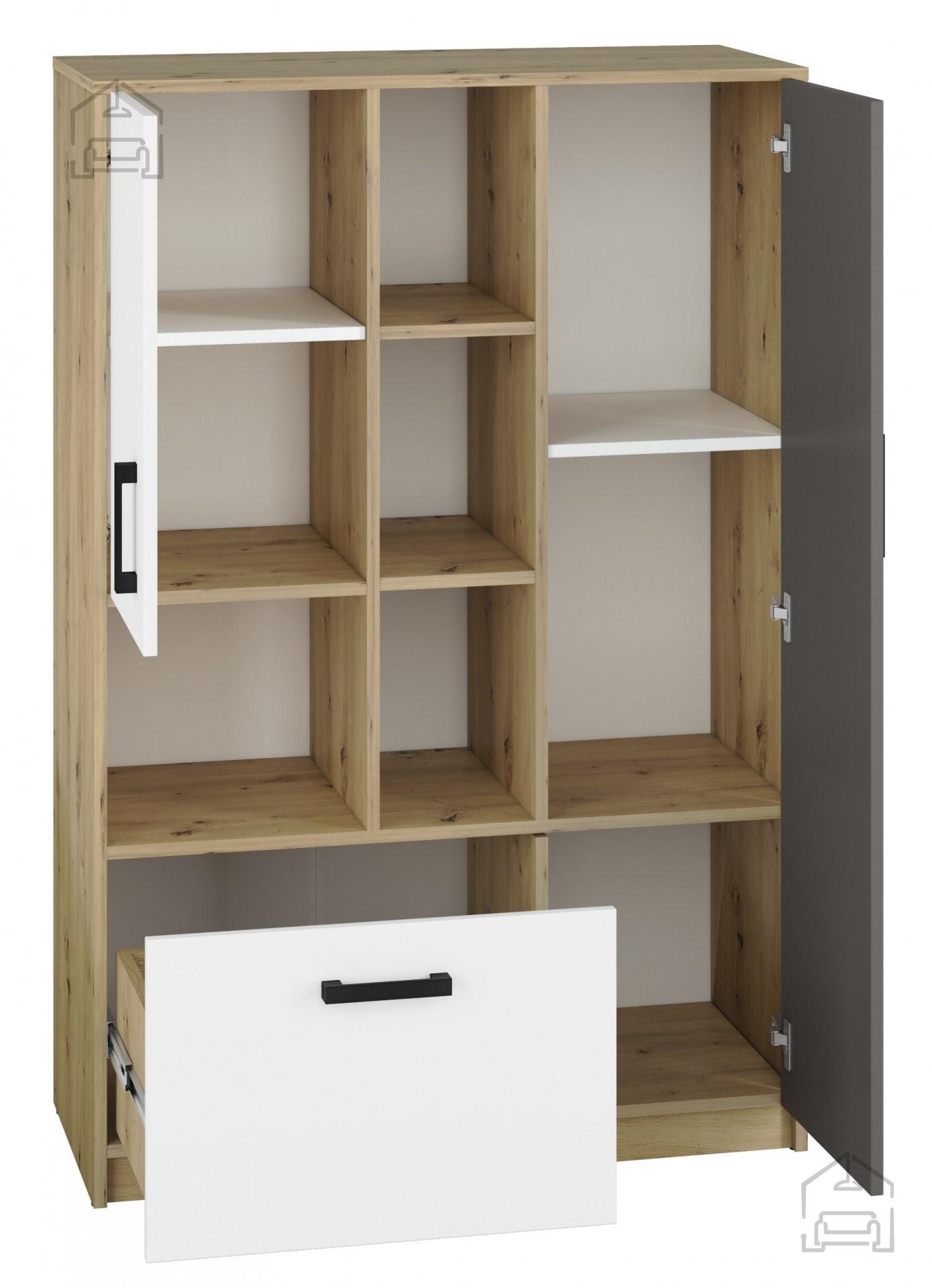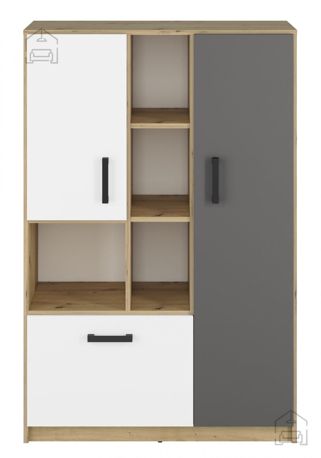 Barva: Hrast Artisan + Bela + SivaDimenzije: 920x1390x400 mm Kolekcija pohištva Fini je namenjena otroškim in mladinskim sobam in bo "zrasla" skupaj z vašim otrokom. Zasnovana je tako da pomaga spodbujati otrokovo ustvarjalnost in vzdrževati red. Fini vsebuje pohištvo za otroke od rojstva in vse do najstniških let.