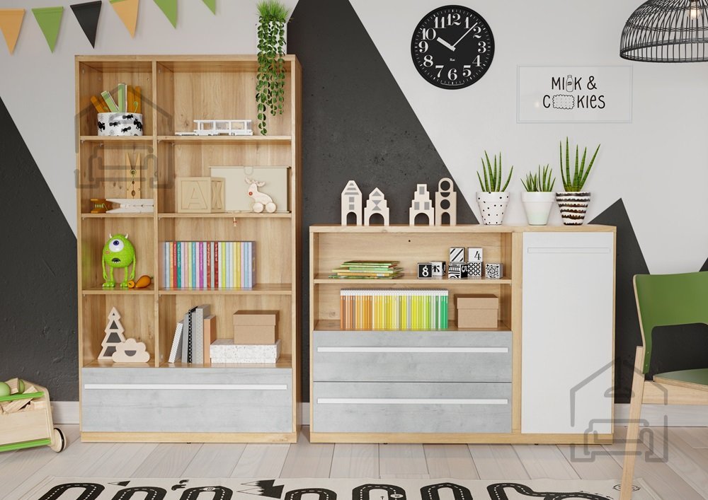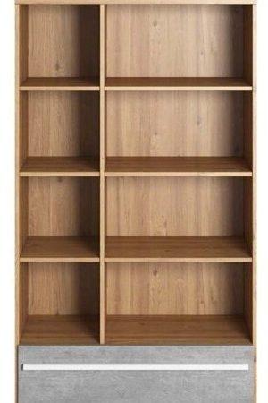 Dimenzije: 900x1610x410 mm Knjižna polica Plano PN-03 je opremljena s širokim, prostornim predalom, v katerega lahko udobno shranite, na primer dokumente ali drobne predmete. Tanko ohišje, police v barvi lesa v kombinaciji s sivim predalom poskrbijo, da je knjižna polica videti sodobna in se zlahka prilega različnim stilom. Pohištvo izgleda odlično v kombinaciji z drugimi kosi iz kolekcije PLANO, na primer s pisalno mizo, garderobnimi omarami ali komodi. | Material: Iveral