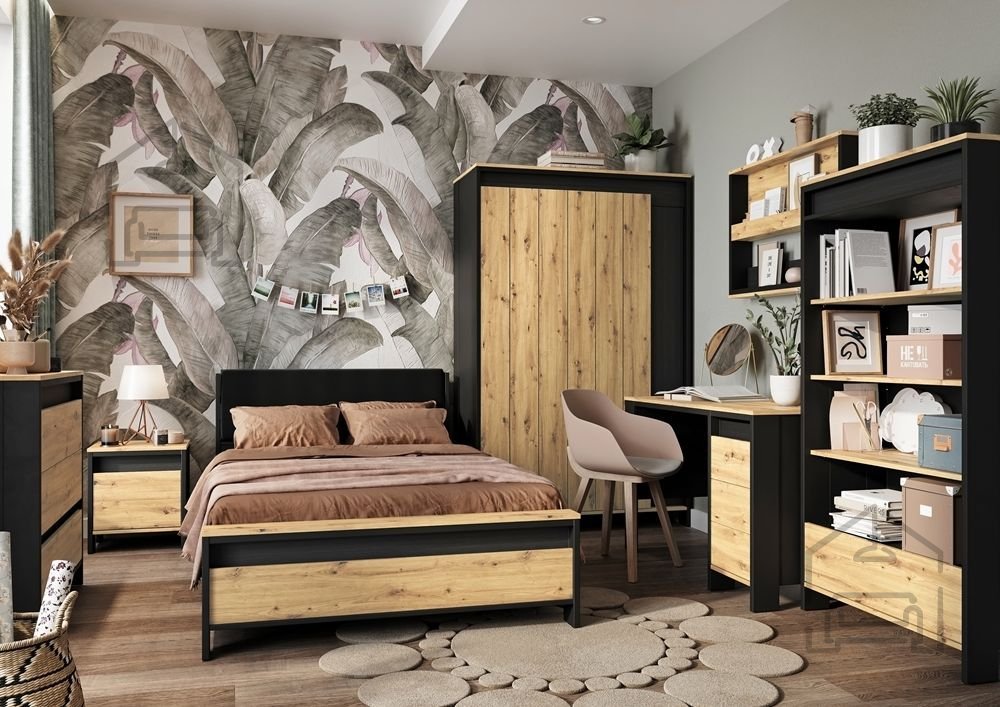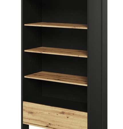 LED osvetlitev: vključena v cenoDimenzije: 720x1610x380 mm Prostor za razstavljanje vaših najljubših knjig, okraskov ali na primer rastlin bo uporaben v skoraj vsaki notranjosti. Regal SP-03 je odličen za ta namen, saj je opremljena s prostornimi policami in lahko dostopnim predalom. Prostorne fronte brez ročajev, ozke noge in brezčasni dekorji v črni barvi in toplem lesu so najbolj značilne lastnosti pohištva. Kolekcija vključuje vse, kar potrebujete za ureditev funkcionalne in modne notranjosti. | Ležalna površina: 80x190 cm
