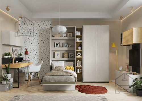 Kolekcijo sestavljajo postelja, številne omare, poličniki, regali, komode, pisalna miza, police...