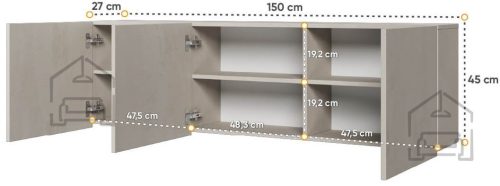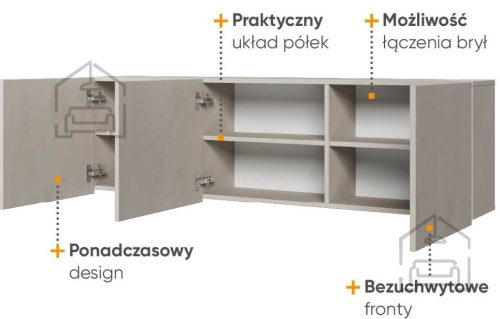 Modna viseča omarica za mladostniško sobo s tremi vrati vam omogoča, da na zanimiv način izkoristite stenski prostor za shranjevanje. Odlično se bo obnesel, ko bo obešen nad ostalim pohištvom iz kolekcije, na primer nad mizo. Notranjost nudi praktično razporeditev polic, ki olajšajo urejenost knjig, iger ali drugih šolskih potrebščin. Dodatne prednosti, ki karoseriji dajejo minimalističen slog, vključujejo sprednje strani brez ročajev. Stenska omarica je odlična rešitev za majhne prostore, kjer želimo prihraniti čim več prostora.