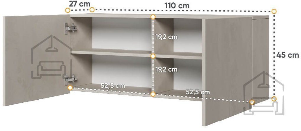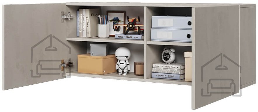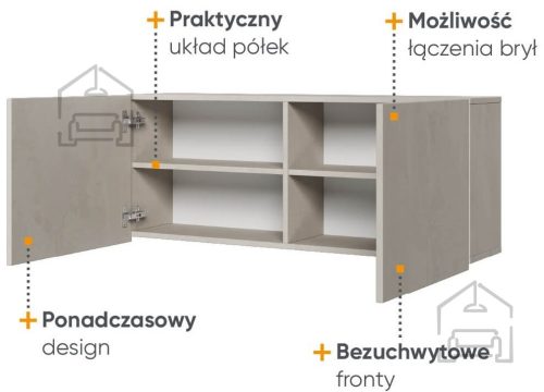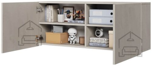 Modna in brezčasna dvovratna viseča omarica za mladostniško sobo vam bo pomagala izkoristiti stenski prostor za shranjevanje. Odlično izgleda obešeno nad drugim pohištvom iz kolekcije, na primer nad mizo ali omaro TF-08. V notranjosti je funkcionalna razporeditev polic, ki olajša urejenost šolskih pripomočkov in knjig. Sprednji deli brez ročajev dajejo karoseriji minimalističen značaj. Stenska omarica je odlična možnost za majhne prostore, kjer želimo maksimalno izkoristiti potencial prostora. | Material: Iveral