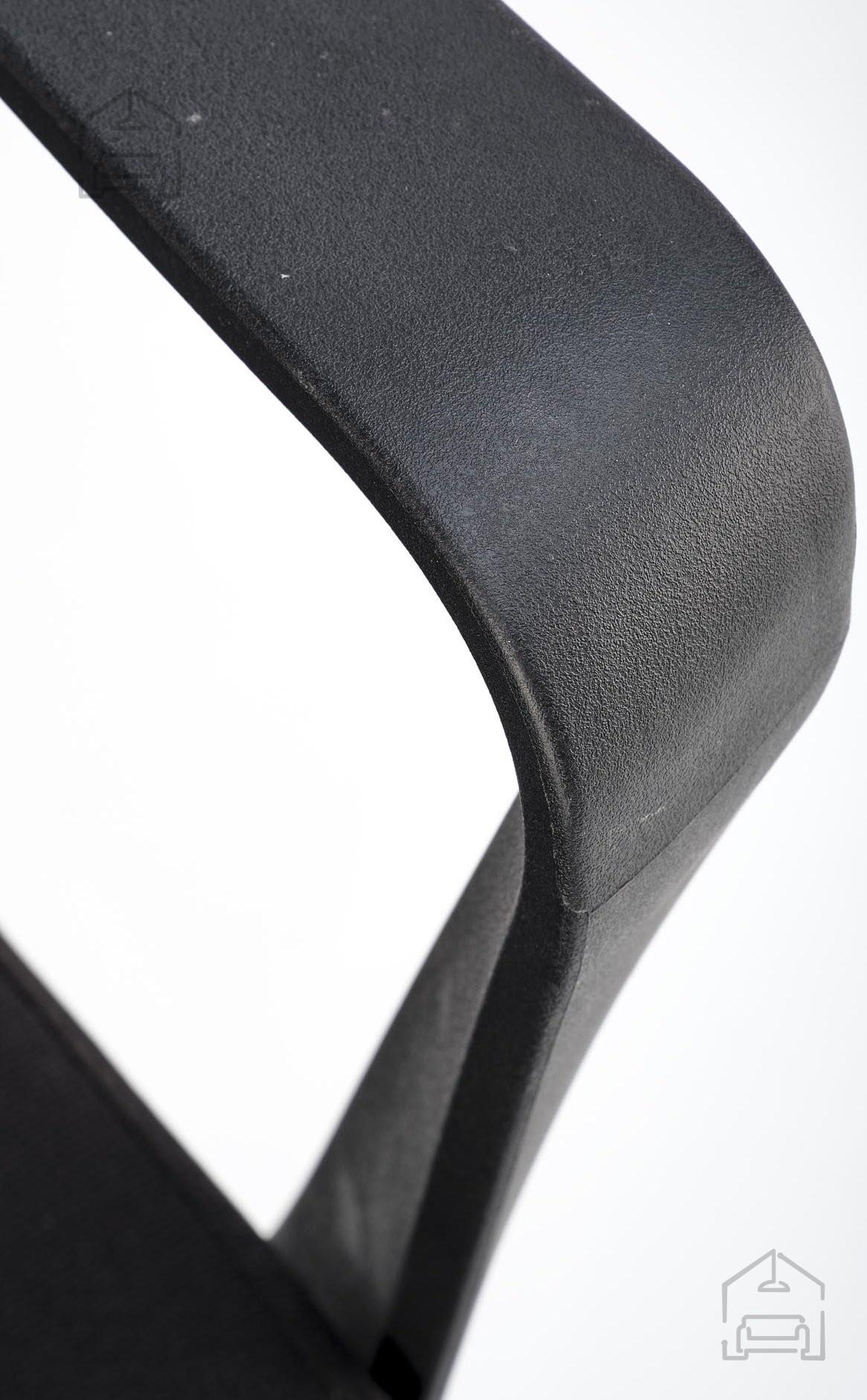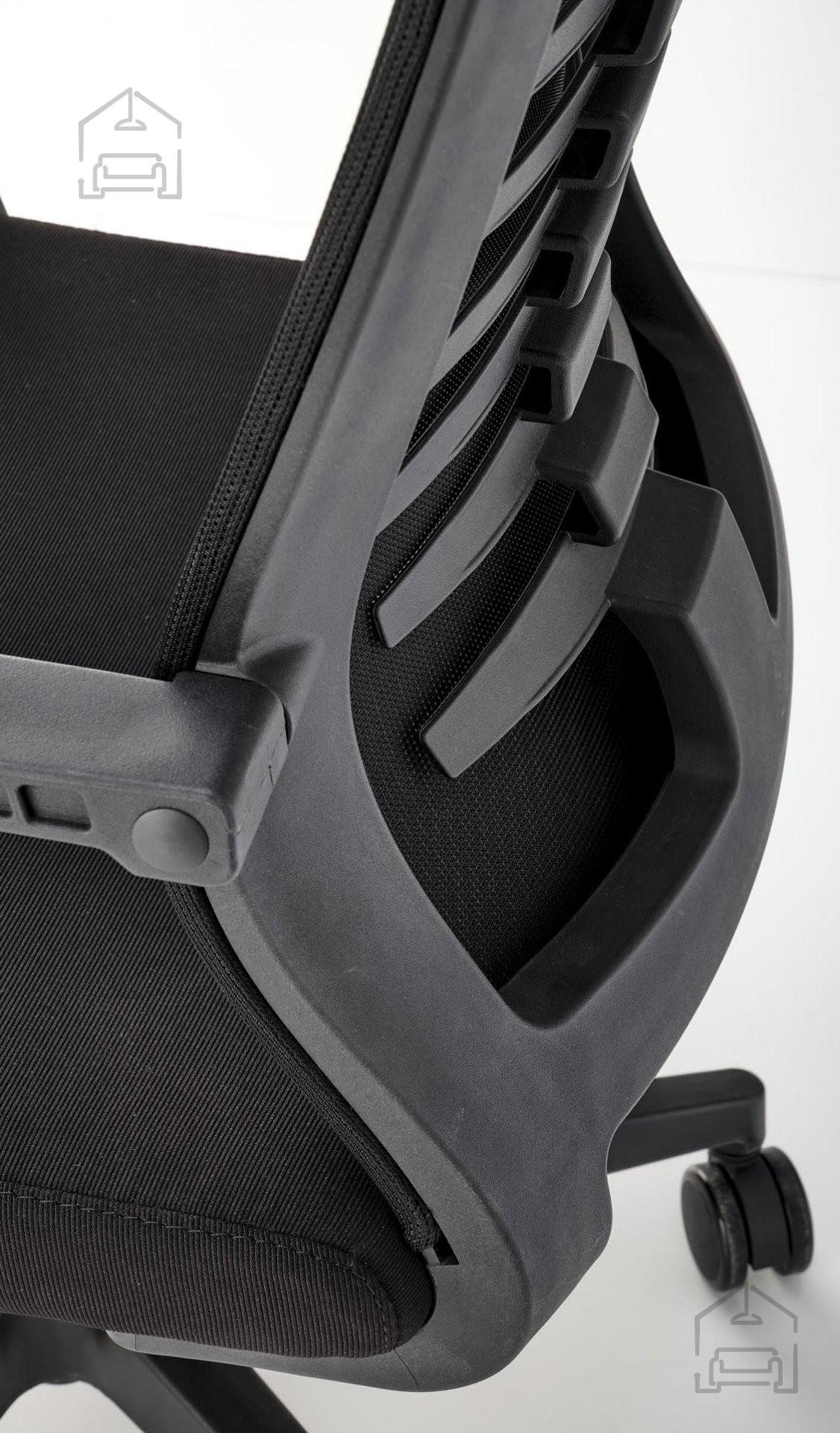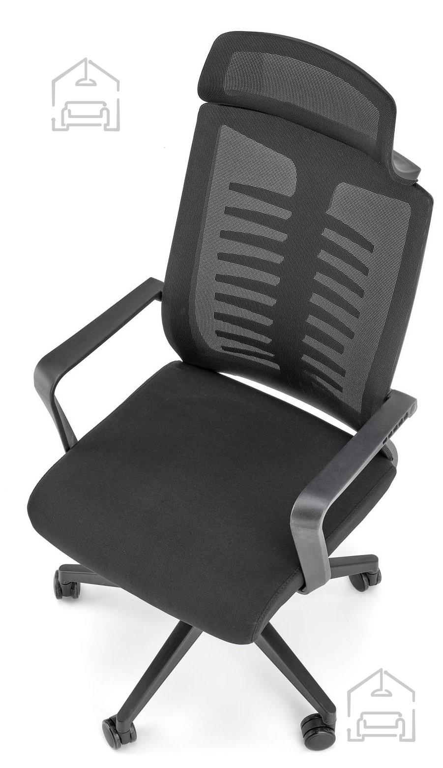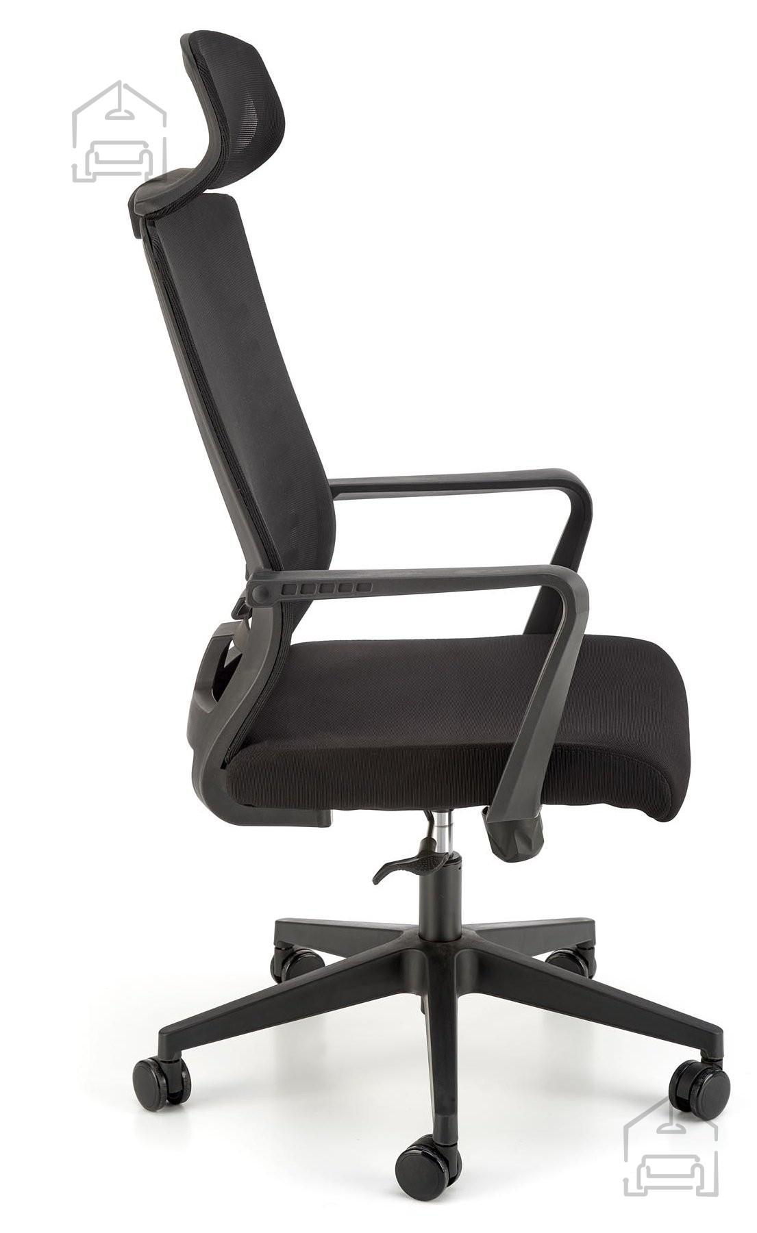 Stol je oblazinjen v kombinaciji tkanine in mreže v nevtralni črni izvedbi. Ima naslon za glavo, plastične naslone za roke in je zaključena s črno rozeto s plastičnimi kolesi. | Material: Iveral