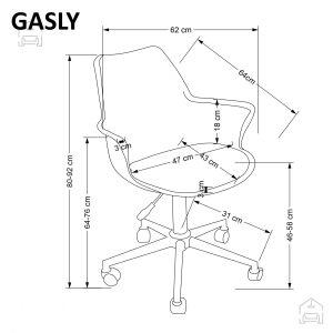 Dimenzije: 62x64x80-92x46-58 cmDimenzije: 620x800x640 mm Vrtljivi pisarniški stol Gasly odlikuje sodobna oblika, ki bo všeč tudi najzahtevnejšim kupcem. Razpoložljive barve v kombinaciji z belo osnovo izgledajo zelo lično in dizajnersko.