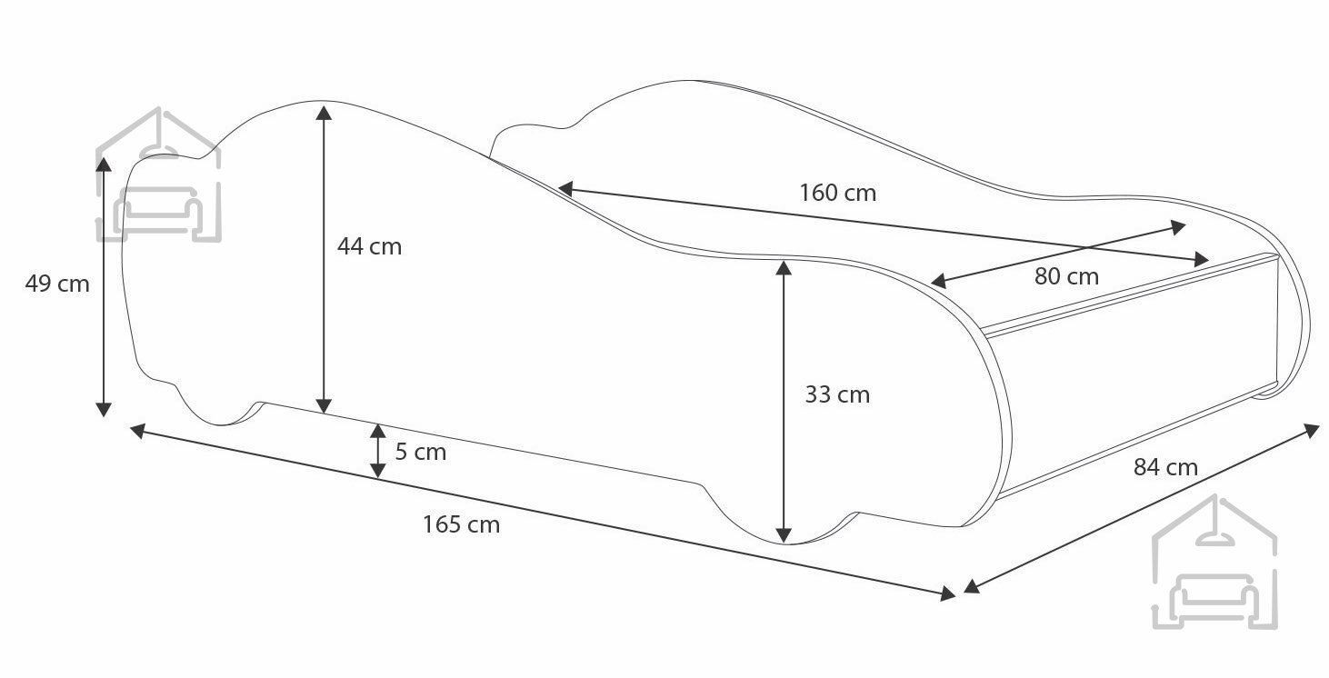 Vzmetnica je vključena v komplet.Dimenzije: 840x490x1650 mm Postelja je narejena tako, da združuje funkcionalnost, modernost in predvsem kakovost. Posebnost te postelje je izdelana v obliki avtomobila. | Ležalna površina: 75x180 cm