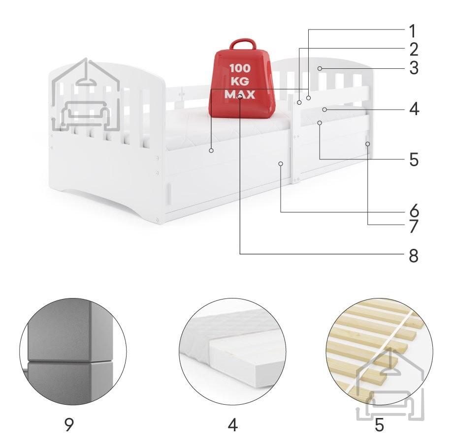 Otroška postelja Lucky je izjemno priljubljen izbor med otroškimi posteljami iz več razlogov. Ne le zaradi zelo privlačne cene, temveč tudi zaradi tega, ker je v komplet vključeno vse, kar vaš otrok potrebuje za dober spanec. Poleg postelje sta v set namreč vključena tudi posteljni pod in ležišče iz pene (7 cm debeline). Da boste zadovoljni tudi vi, je tu še velik predal za shranjevanje posteljnine ali česar koli drugega. In za popolno brezskrbnost staršev je tu še varovalna ograja, ki bo preprečila morebiten padec vašega otroka med spanjem. S posteljo Lucky boste privarčevali pri času in denarju.