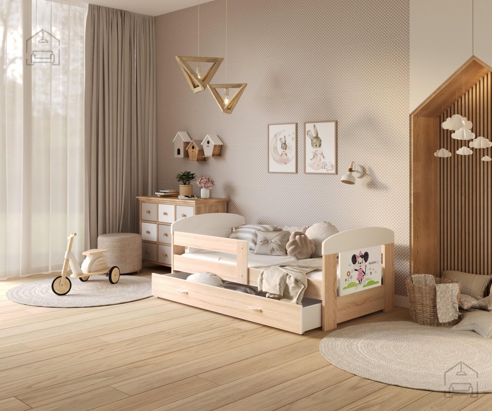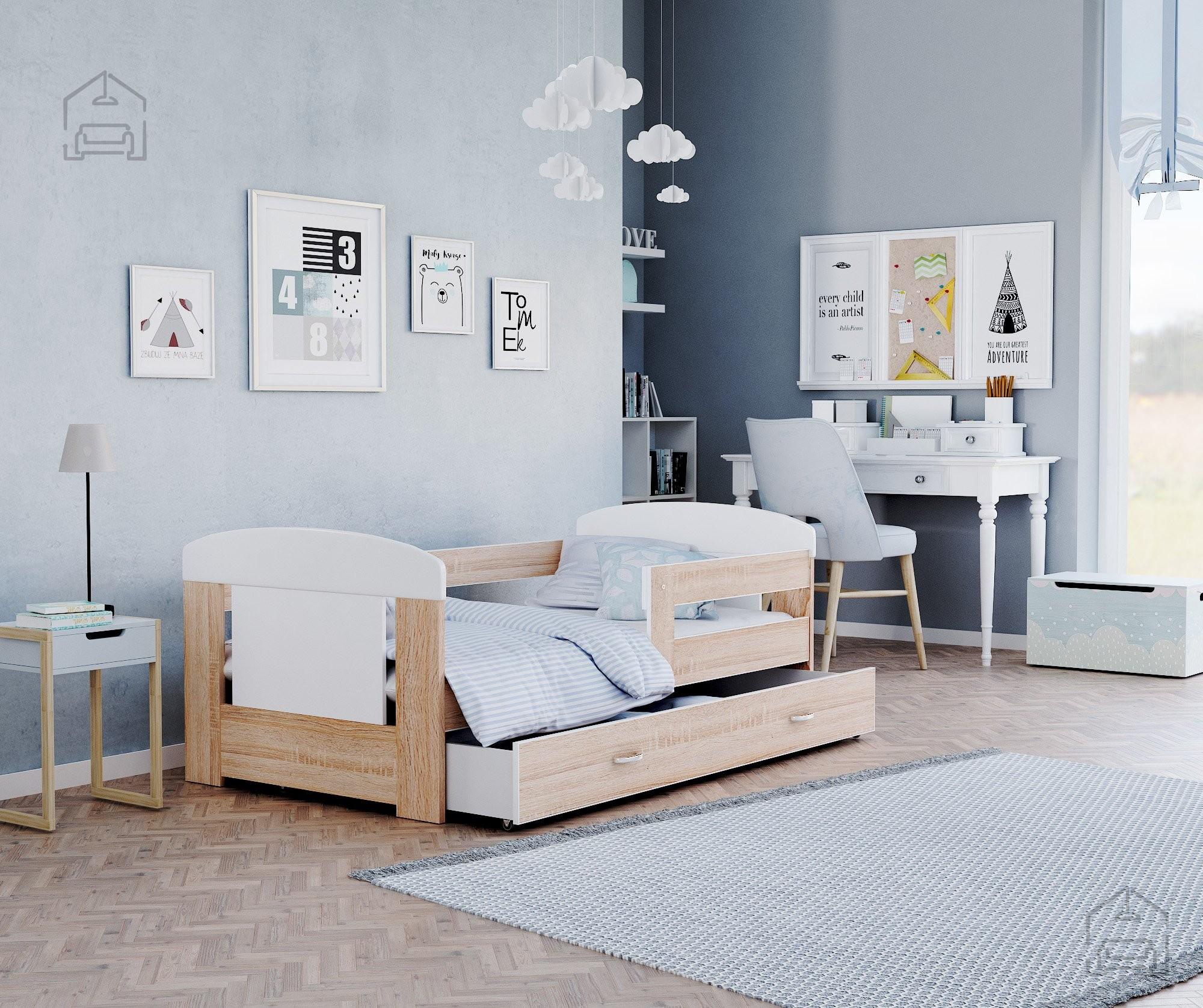 Otroška postelja Filip ni le estetsko privlačna, ampak ponuja tudi številne funkcionalne prednosti. V kompletu je posteljni pod ter ležišče iz pene debeline 7 cm, kar zagotavlja udobje in podporo med spanjem. Dodatna prednost je predal za posteljnino, ki nudi odličen prostor za shranjevanje posteljnine in igrač, kar pripomore k ohranjanju reda v sobi.