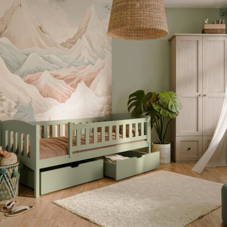 - Estetski videz: Olivna barva postelje doda pridih elegance in topline v otroško sobo. Nevtralni toni omogočajo enostavno kombiniranje z različnimi dekorativnimi elementi, kar omogoča ustvarjanje prijetnega in mirnega okolja za vašega otroka.