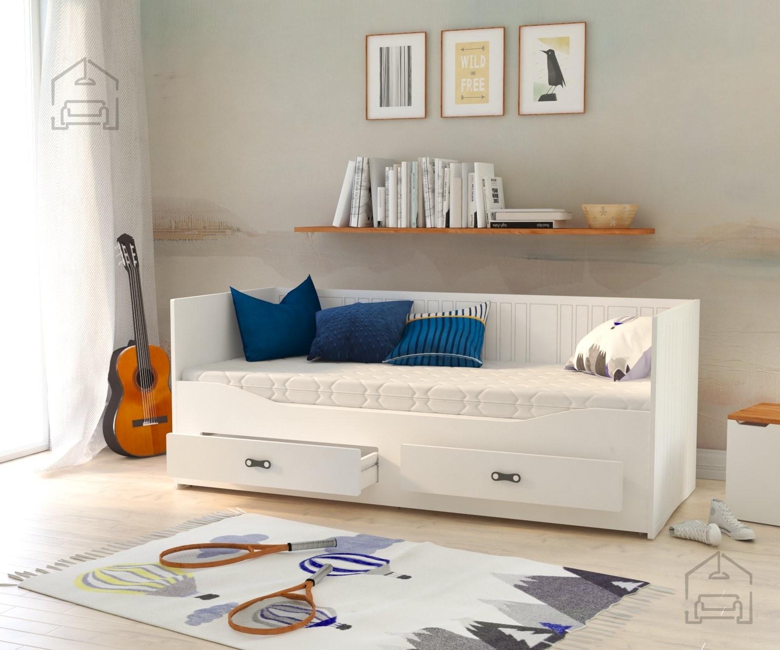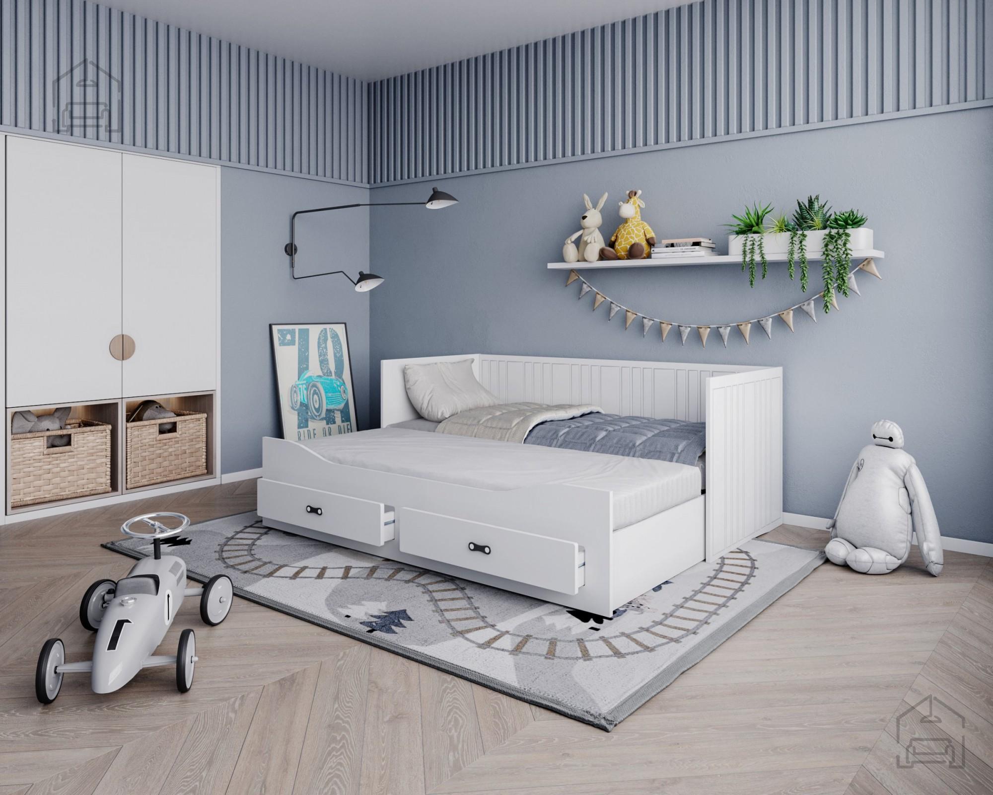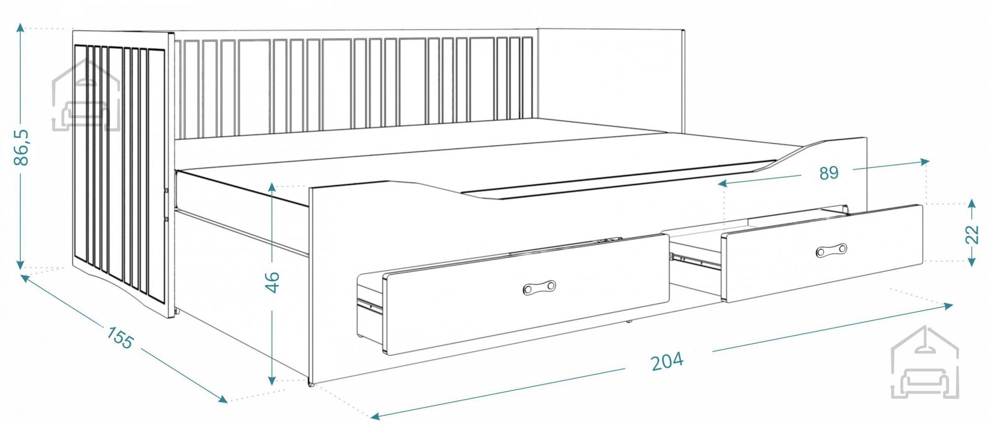 Sodobna otroška postelja z dodatnim ležiščem je namenjena fantom in deklicam. Otroška postelja je narejena tako, da združuje funkcionalnost, modernost in predvsem kakovost in varnost za vašega otroka, ker ima močen okvir iz bora. Praktične dimenzije zagotavljajo, da postelja ne zasede veliko prostora, zato je več prostora za igranje ali učenje. Otroška postelja je narejena iz borovega lesa. Postelja ima prostor za shranjevanje v obliki dveh predalov. | Material: MDF