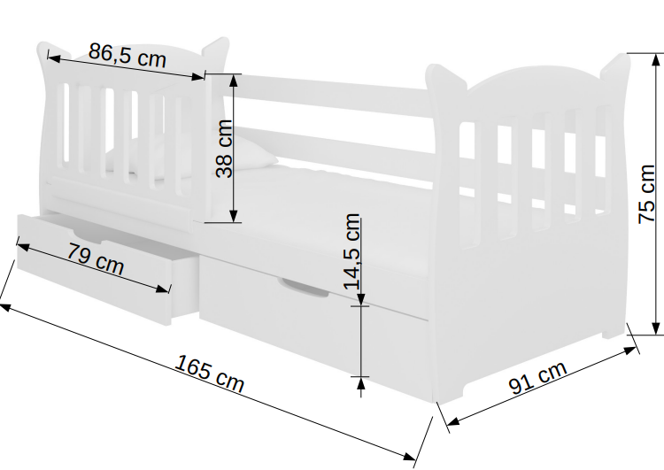 Sodobna otroška postelja z dodatnim ležiščem je namenjena fantom in deklicam. Otroška postelja je narejena tako, da združuje funkcionalnost, modernost in predvsem kakovost in varnost za vašega otroka, ker ima močen okvir iz bora. Praktične dimenzije zagotavljajo, da postelja ne zasede veliko prostora, zato je več prostora za igranje ali učenje. Otroška postelja je narejena iz borovega lesa. Postelja ima prostor za shranjevanje v obliki dveh predalov. |