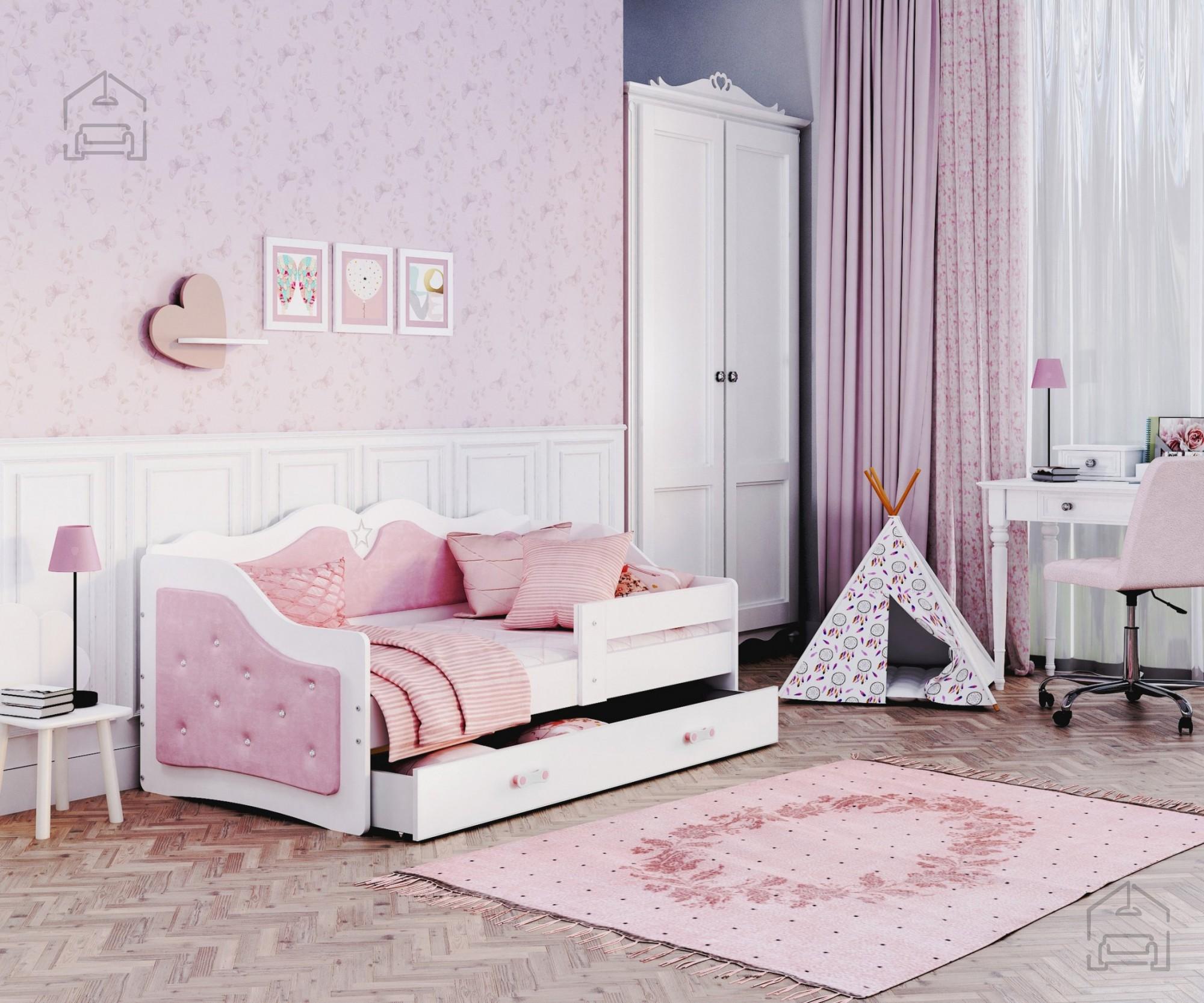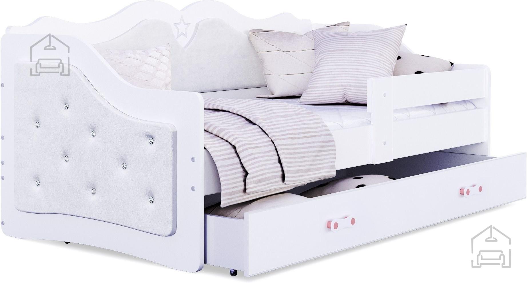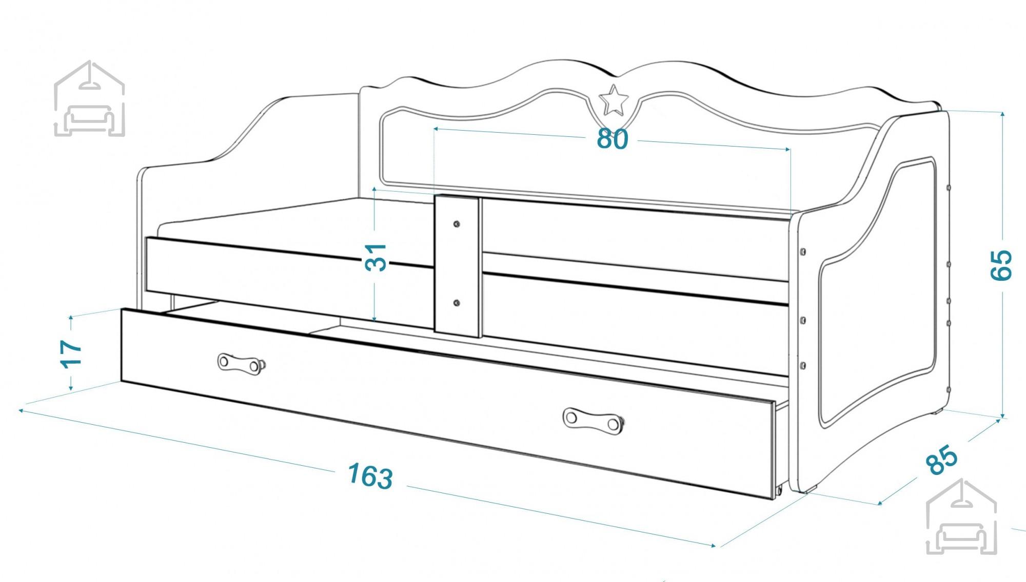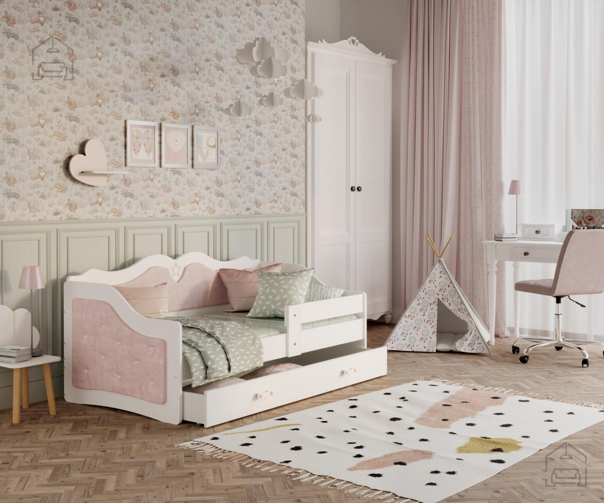 Sodobna otroška postelja z dodatnim ležiščem je namenjena fantom in deklicam. Otroška postelja je narejena tako, da združuje funkcionalnost, modernost in predvsem kakovost in varnost za vašega otroka, ker ima močen okvir iz bora. Praktične dimenzije zagotavljajo, da postelja ne zasede veliko prostora, zato je več prostora za igranje ali učenje. Otroška postelja je narejena iz borovega lesa. Postelja ima prostor za shranjevanje v obliki dveh predalov. | Material: tkanina/masiven les