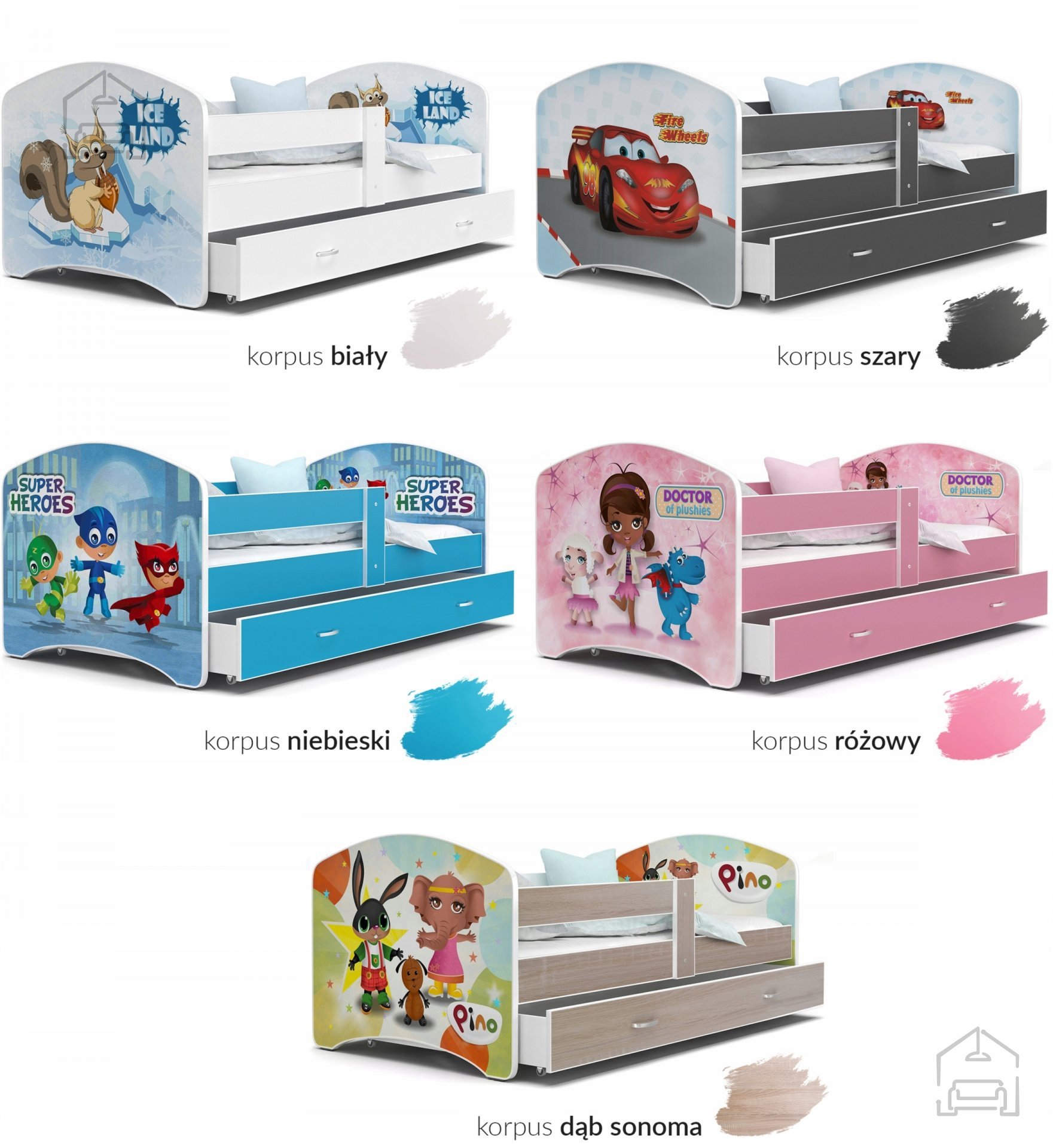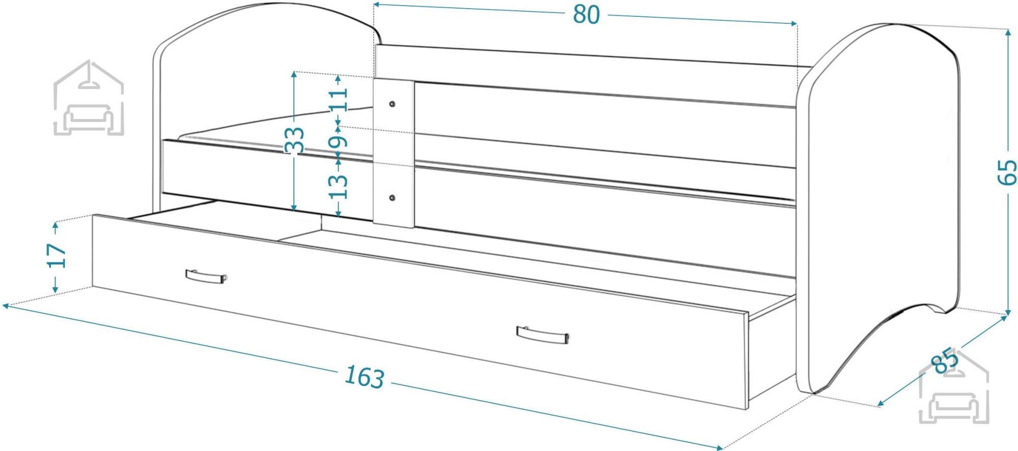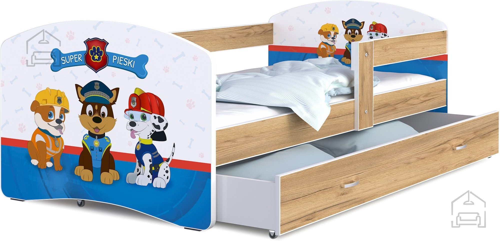 Sodobna otroška postelja z dodatnim ležiščem je namenjena fantom in deklicam. Otroška postelja je narejena tako, da združuje funkcionalnost, modernost in predvsem kakovost in varnost za vašega otroka, ker ima močen okvir iz bora. Praktične dimenzije zagotavljajo, da postelja ne zasede veliko prostora, zato je več prostora za igranje ali učenje. Otroška postelja je narejena iz borovega lesa. Postelja ima prostor za shranjevanje v obliki dveh predalov. | Material: tkanina/masiven les