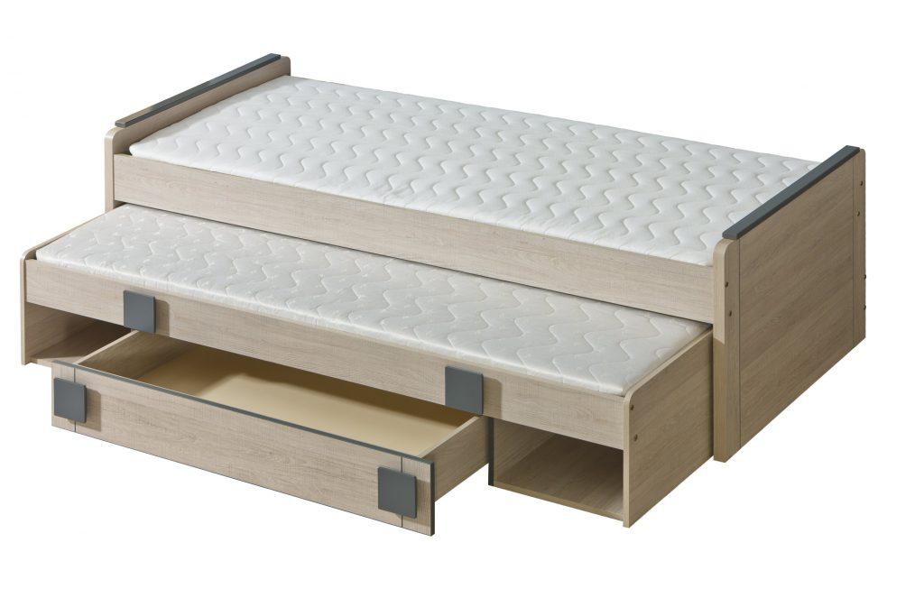 Sodobna otroška postelja z dodatnim ležiščem je namenjena fantom in deklicam. Otroška postelja je narejena tako, da združuje funkcionalnost, modernost in predvsem kakovost in varnost za vašega otroka, ker ima močen okvir iz bora. Praktične dimenzije zagotavljajo, da postelja ne zasede veliko prostora, zato je več prostora za igranje ali učenje. Otroška postelja je narejena iz borovega lesa. Postelja ima prostor za shranjevanje v obliki dveh predalov. | Material korpusa: Laminirana plošča