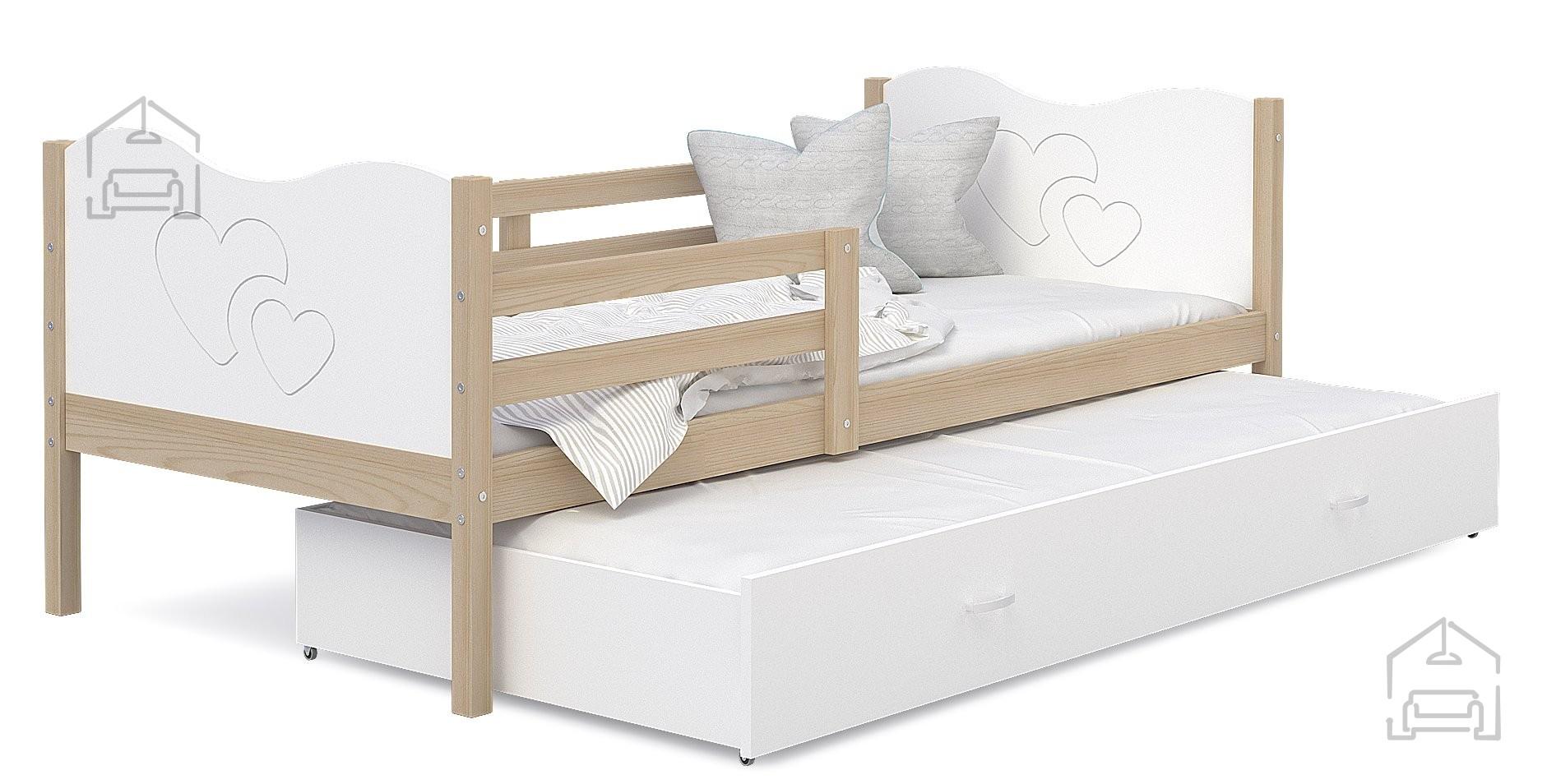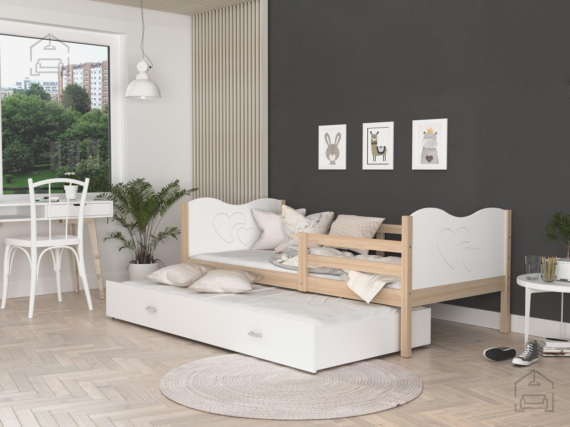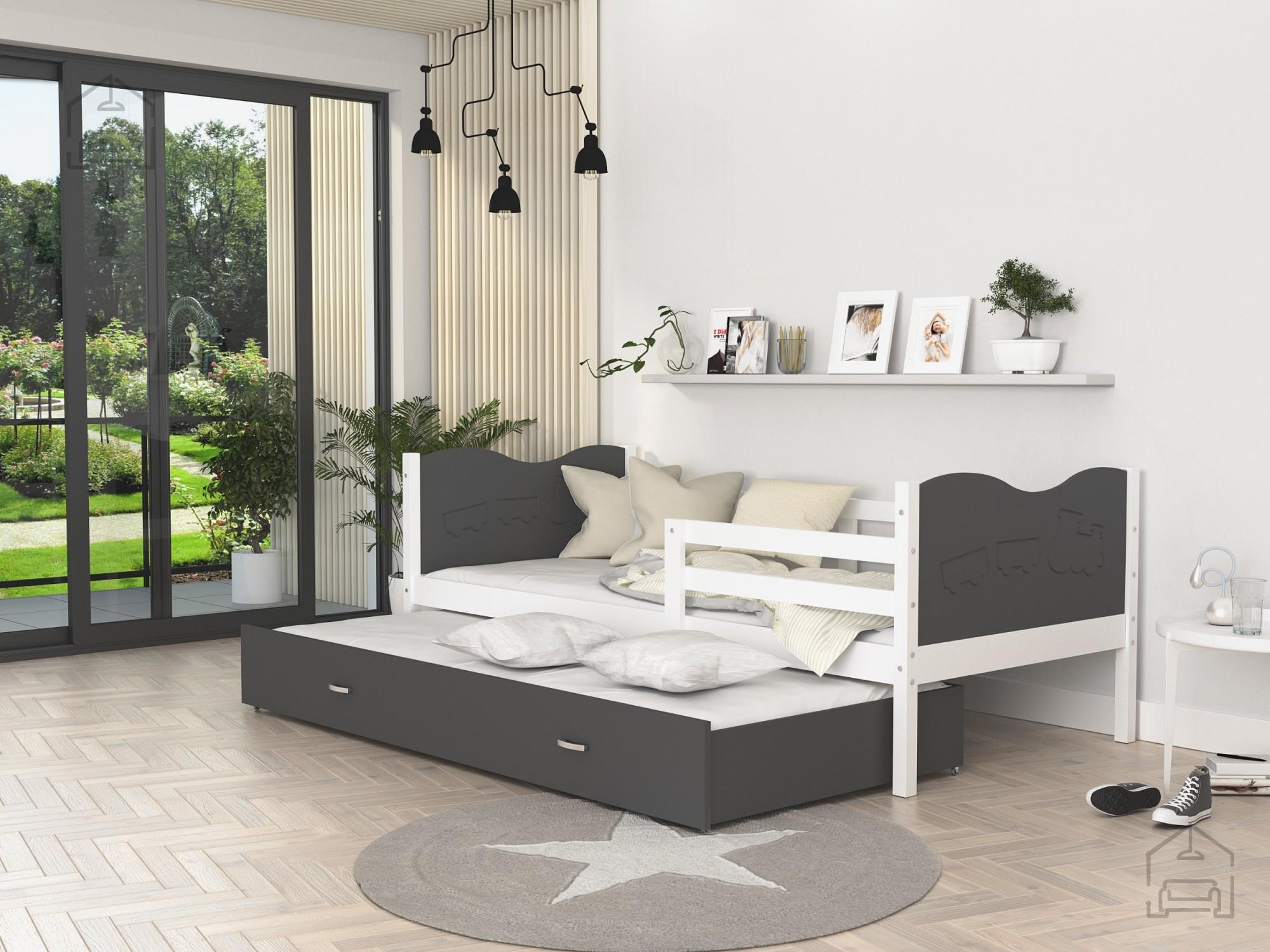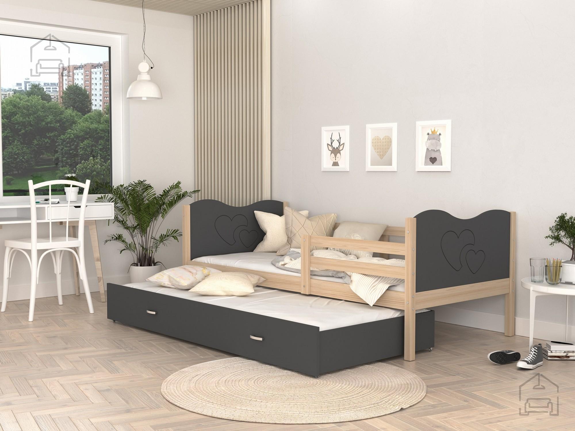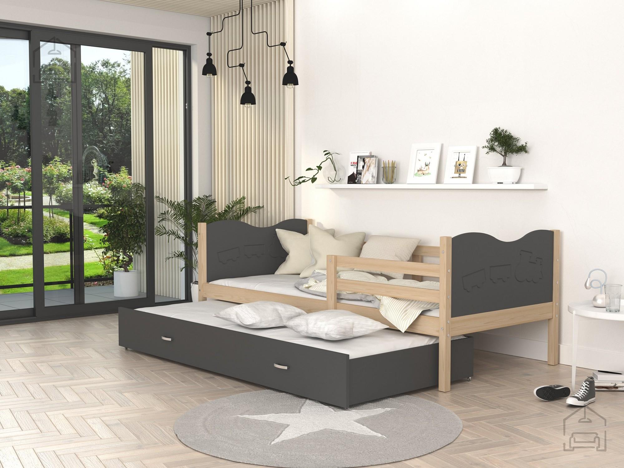 Postelja ima tudi prostoren predal, ki se izvleče ven in je primerno kot dodatno ležišče (tudi dodatna vzmetnica je vključena v ceno). Postelja je primerna tudi za malčke, ker ima ob strani ograjico, ki varuje otroka pred padcem. | Material: Iveral 16 mm Barva: kathult + sivaDimenzije: 1700x900x420 mm