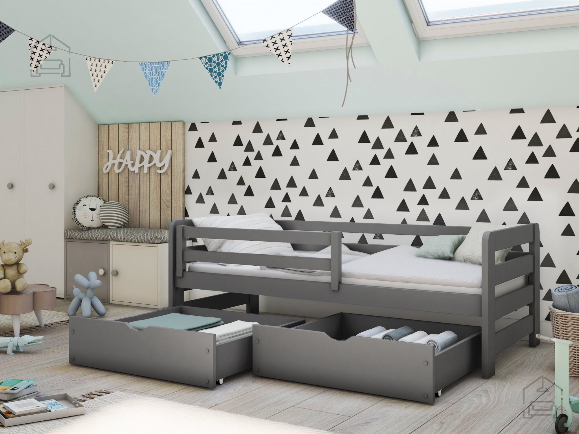 Sodobna otroška postelja z dodatnim ležiščem je namenjena fantom in deklicam. Otroška postelja je narejena tako, da združuje funkcionalnost, modernost in predvsem kakovost in varnost za vašega otroka, ker ima močen okvir iz bora. Praktične dimenzije zagotavljajo, da postelja ne zasede veliko prostora, zato je več prostora za igranje ali učenje. Otroška postelja je narejena iz borovega lesa. Postelja ima prostor za shranjevanje v obliki dveh predalov.