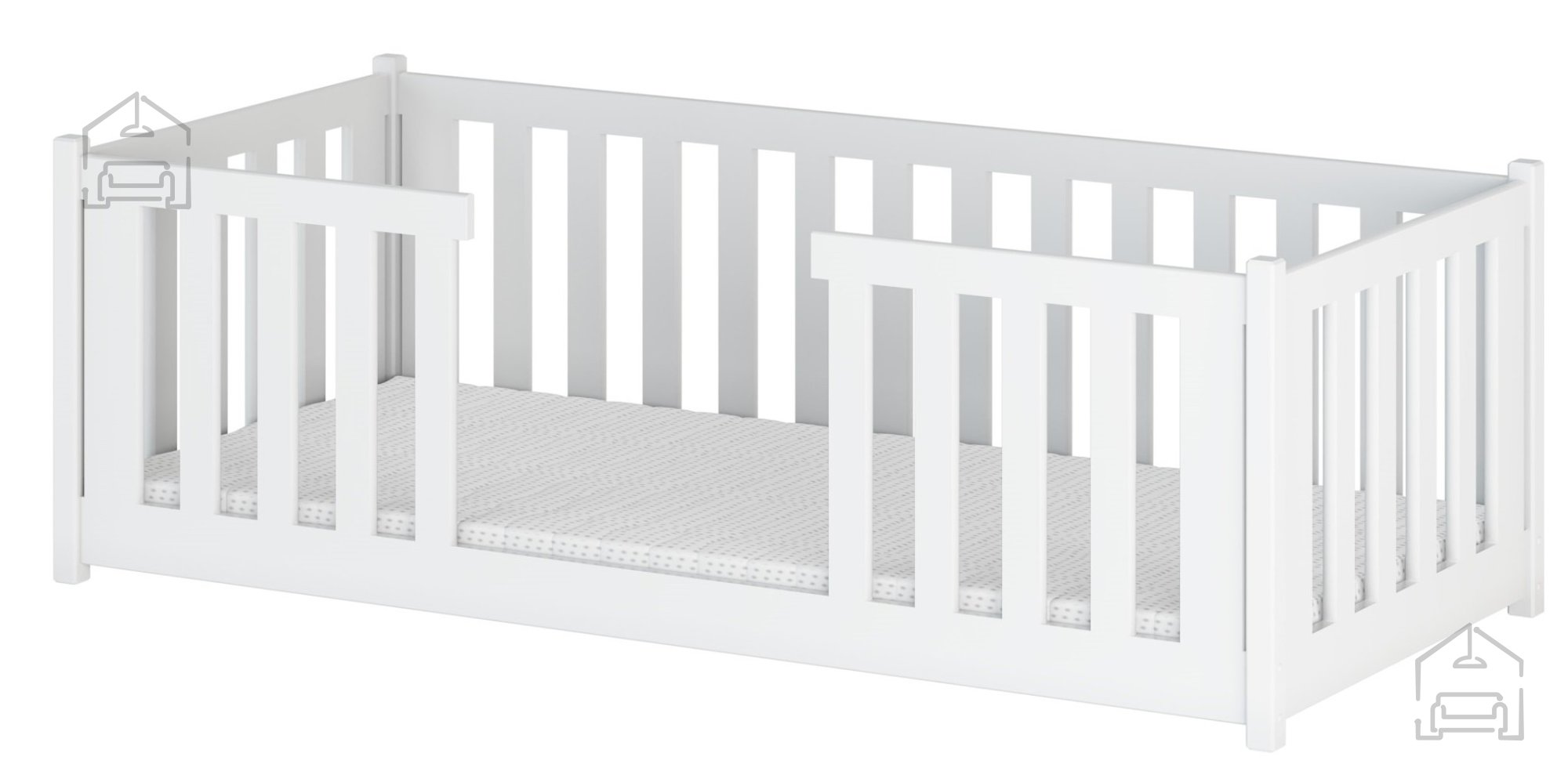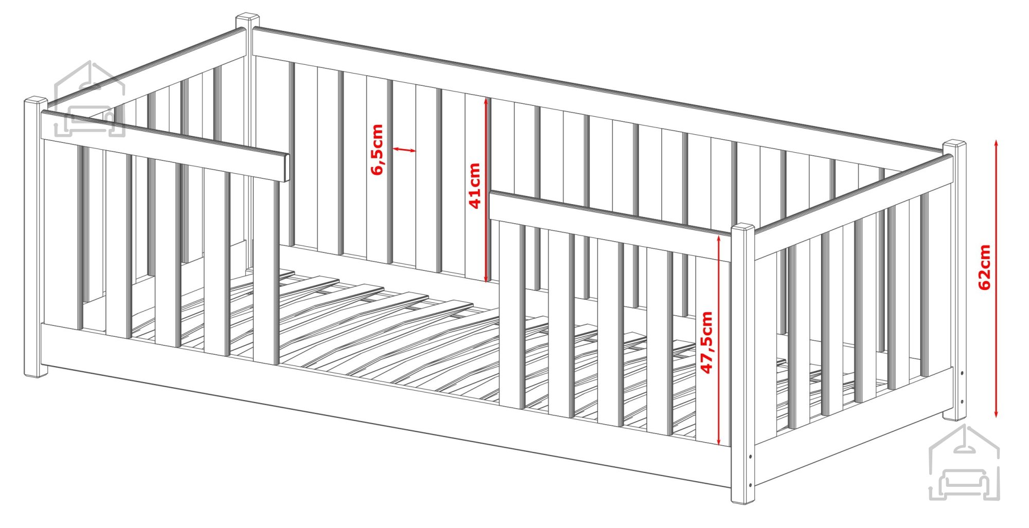 • Prečke in nizka konstrukcija postelje zagotavljajo varnost otroka, še posebej, če je še premajhen, da bi spal brez nadzora. Poleg tega je postelja opremljena s pregrado, ki dodatno poveča varnost med spanjem.