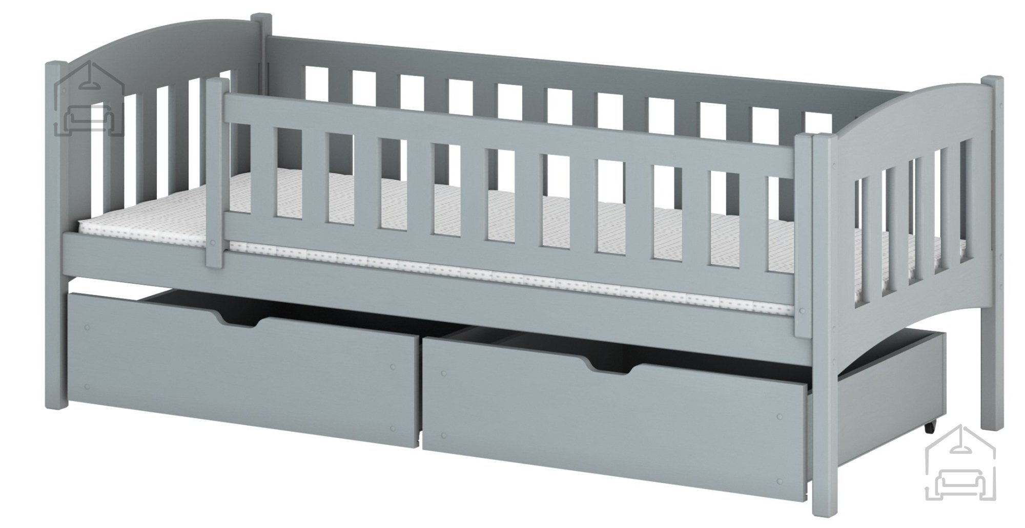 Priložena pregrada in predali: v kompletu je priložena navpična odstranljiva pregrada, ki omogoča dodatno varnost med spanjem. Poleg tega postelja vključuje dva prostorna predala, ki so izdelani iz ivernih plošč in omogočajo enostavno shranjevanje otroških stvari.