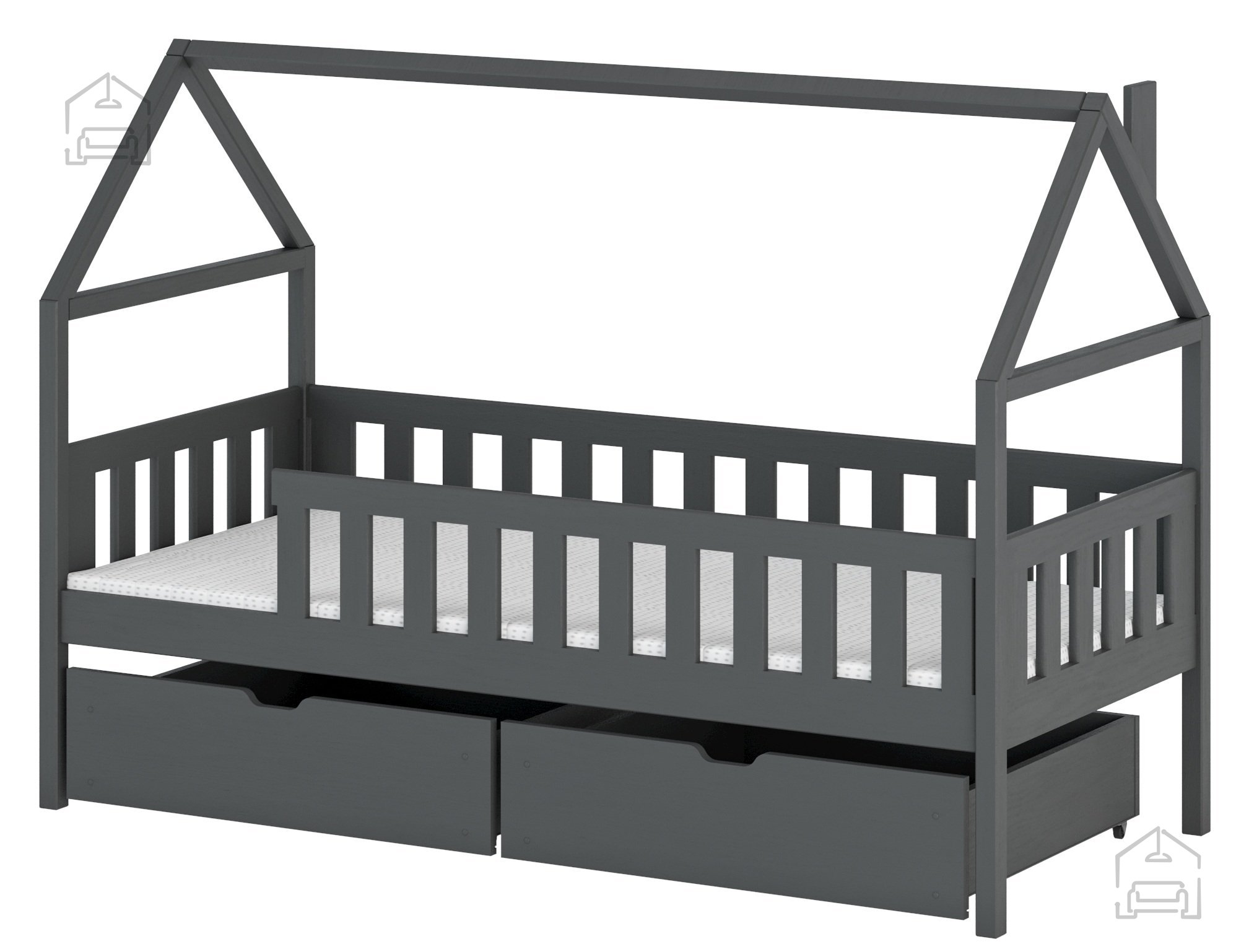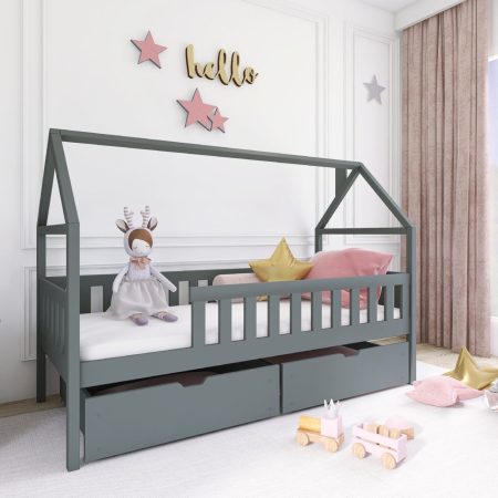 Otroška postelja hiška Domi - 90x190 cm - grafit je odlična izbira za starše, ki iščejo kombinacijo funkcionalnosti, oblikovalske dovršenosti in kakovosti. Ta postelja bo postala priljubljen kotiček vašega otroka in pomemben del njegovega vsakdana. Zaradi svoje univerzalne zasnove se brez težav prilagaja vsakemu prostoru, kar jo naredi popolno za vsako otroško sobo. Izberite posteljo Domi in podarite svojemu otroku varno in udobno zatočišče za sanje in igro. | Material: tkanina, les