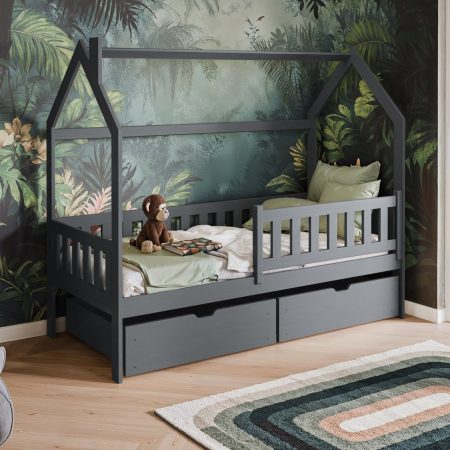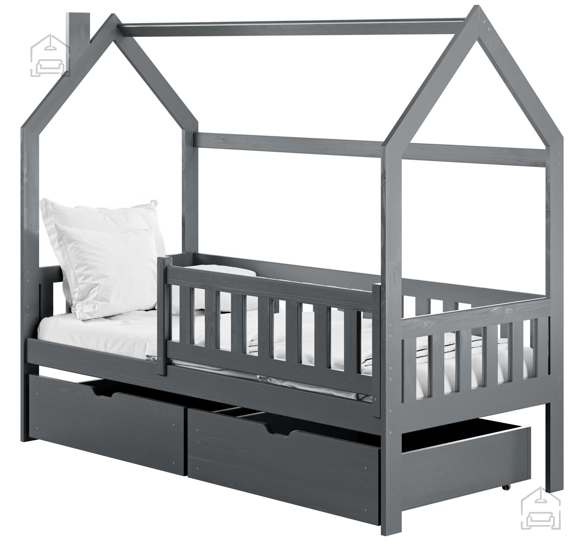 Predstavljamo vam Otroško posteljo hiško Natan, ki je zasnovana tako, da združuje funkcionalnost, varnost in estetsko privlačnost v eni edinstveni postelji. Ta čudovita postelja v obliki hiške je izdelana iz kakovostnega borovega lesa in je prebarvana v elegantni grafitni barvi, ki se popolnoma zlije z vsako otroško sobo in ji doda pridih sodobnosti.