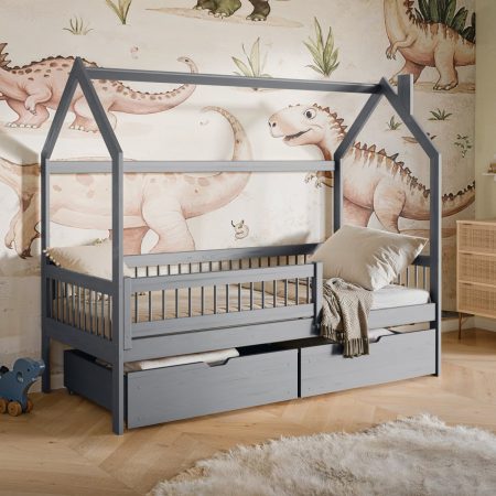 Otroška postelja hiška Oskar - 90x190 cm - siva je popolna kombinacija funkcionalnosti, varnosti in estetskega videza. Ne glede na to, ali opremljate novo otroško sobo ali iščete zamenjavo za obstoječo posteljo, ta postelja bo zagotovo postala središče pozornosti in najbolj priljubljeno mesto vašega otroka. Naročite zdaj in podarite svojemu otroku sanjsko posteljo, ki bo spodbudila njihovo domišljijo in ustvarila prijeten prostor za spanje in igro. | Material korpusa: Laminirana plošča